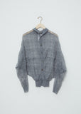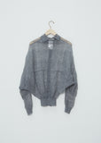 Junya Watanabe grey lace knit cardigan with panel construction and dropped sleeves with tuck detailing. Finished with tonal grey Mother-of-pearl buttons. Small shawl collar with square shaped back collar with split detail. Ribbed sleeve cuffs and hem. Unlined.