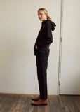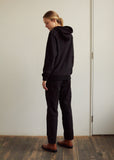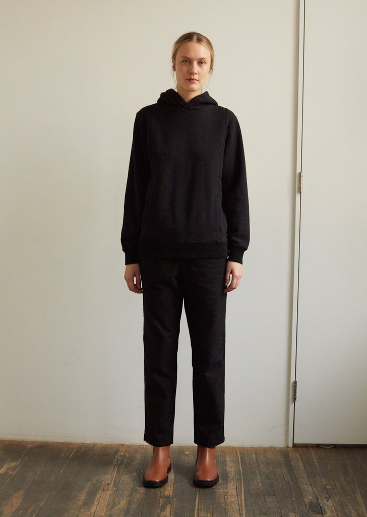 Paneled long-sleeve hooded sweatshirt crafted from black cotton fleece, featuring a center seam at the back. Pulls over. Paneled sides. On-seam front pockets. Ribbed cuffs and bottom band. Straight fit.