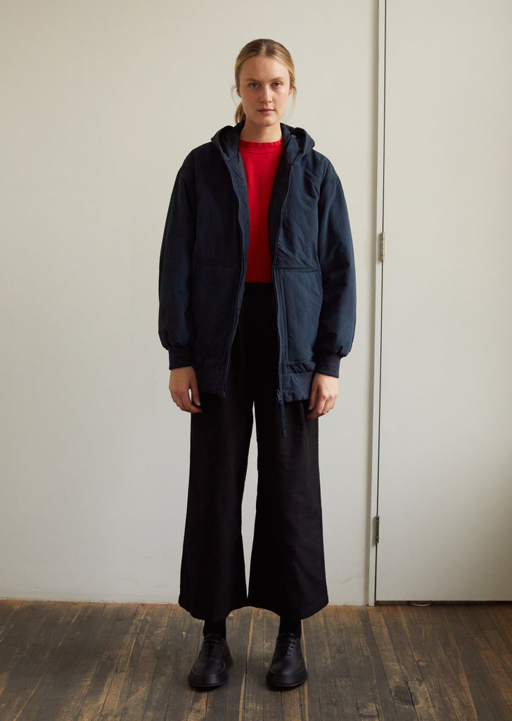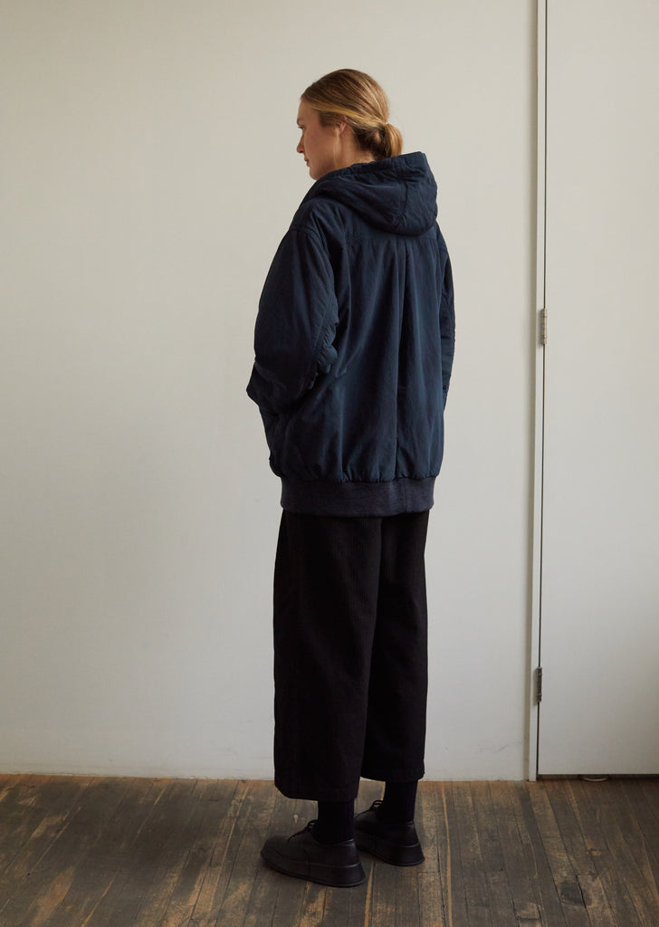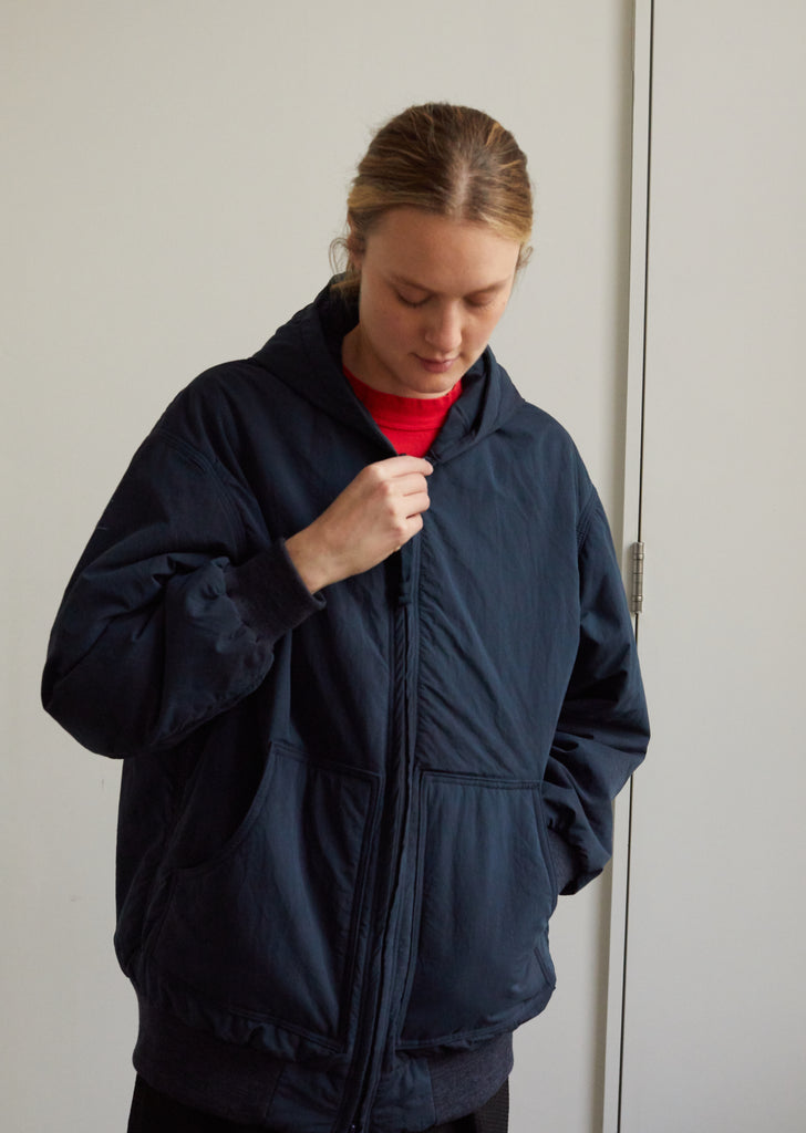 Oversized hooded jacket in midnight-blue waterproof nylon, imagined in a paneled construction with Primaloft insulation. Drop shoulders. Long sleeves. Ribbed cotton-jersey cuffs. Zip front. Slanted front pockets. Gathered back shoulder yoke. Ribbed cotton-jersey insets at bottom band. Generous fit.