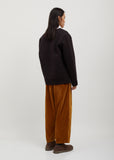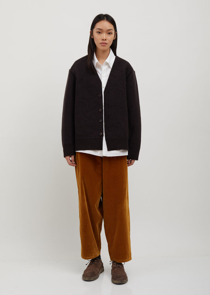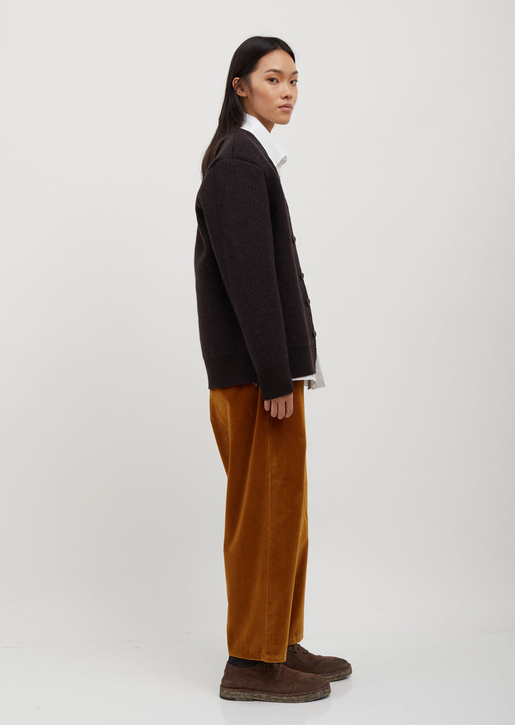 Boxy unisex cardigan in deep-brown double-faced felted merino wool, finished with a raw-cut neckline and placket. Deep V-neck. Drop shoulders. Long sleeves. Horn-button closure. Side-seam slits. Ribbed cuffs and bottom band. Slightly asymmetric hem. Boxy fit.