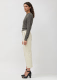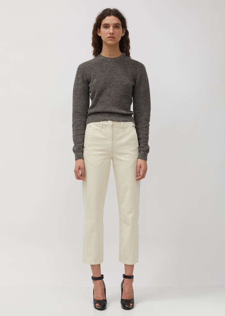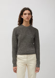 Grey-green rib-knit crewneck sweater crafted of marled linen-blend yarn.