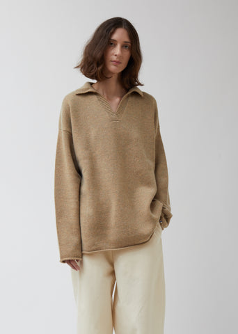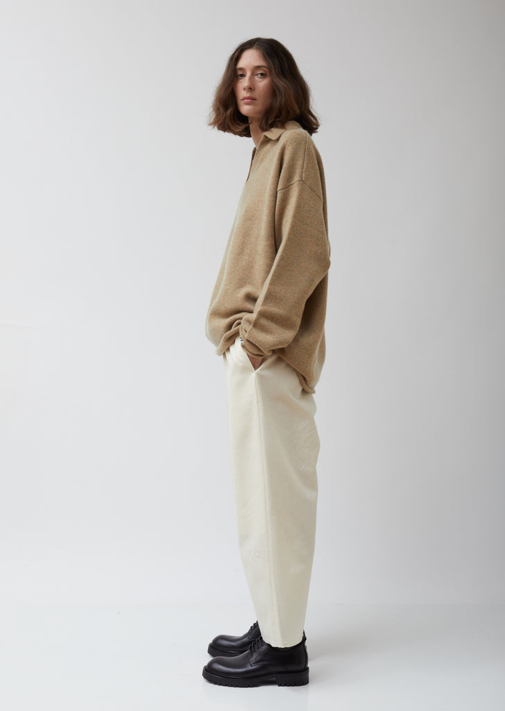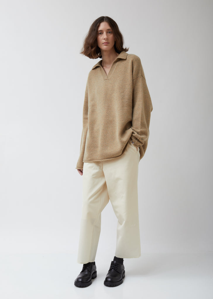 Mid-weight tweed-beige stretch-cashmere sweater with dropped shoulders and a ribbed V-neck—a unisex style with polo-shirt influences. Pullover style. Ribbed spread collar. Exaggerated long sleeves. Rolled edges at cuffs and hem. Signature stripe-stitch detail at left cuff. Hem hits top of thigh. Oversized fit.