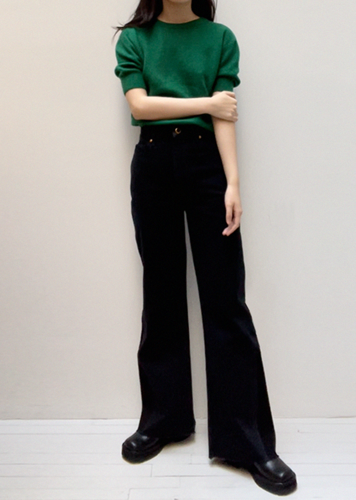 Khaite black flared jean with a cropped length and high-rise silhouette with inset side patches and frayed hems. 5-Pocket styling. Each hand-finished pair has an enameled button of antiqued brass.