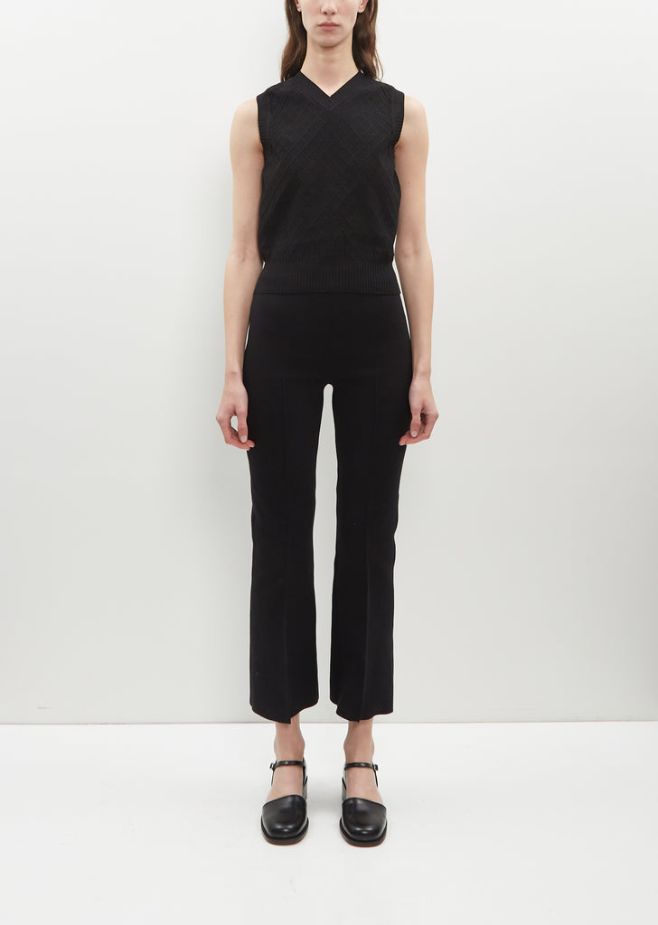 High Sport black cropped pull-on pant with slightly flared legs in soft cotton and lycra blend knit. Features an elasticated waistband, pintucks at front and back legs and two welt pockets at back.
