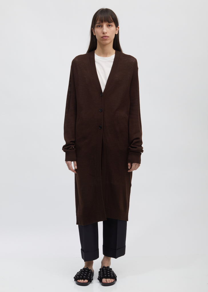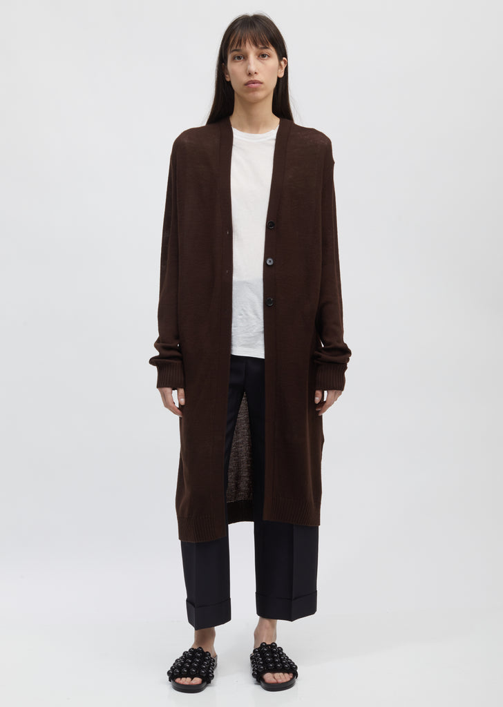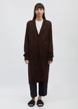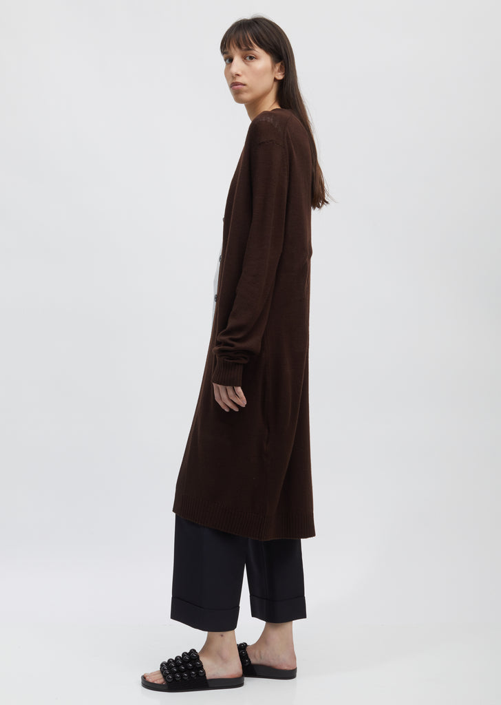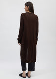 Luxurious long open-weave wool cardigan in a rich chocolate brown wool. A wardrobe staple perfect for everyday and travel.
