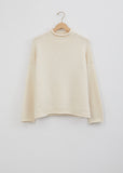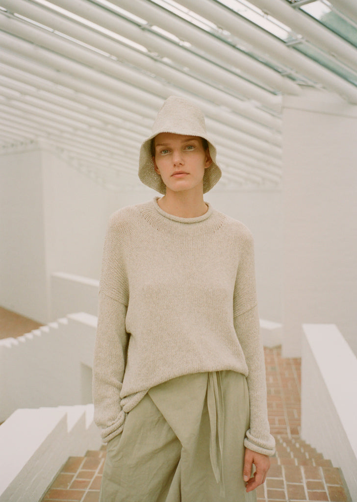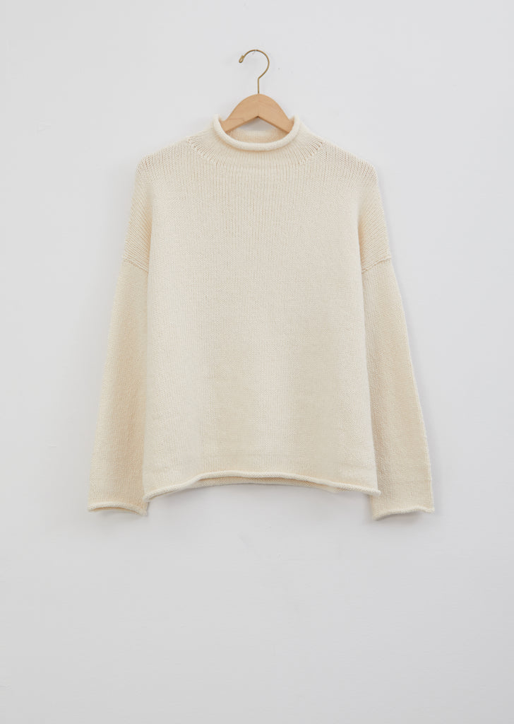 Lauren Manoogian Bateau Rollneck in raw white. This transitional sweater inspired by a classic boatneck is crafted in pima & merino wool blend and knitted in Peru. We love it as the perfect go-to for breezy spring/summer nights.