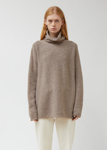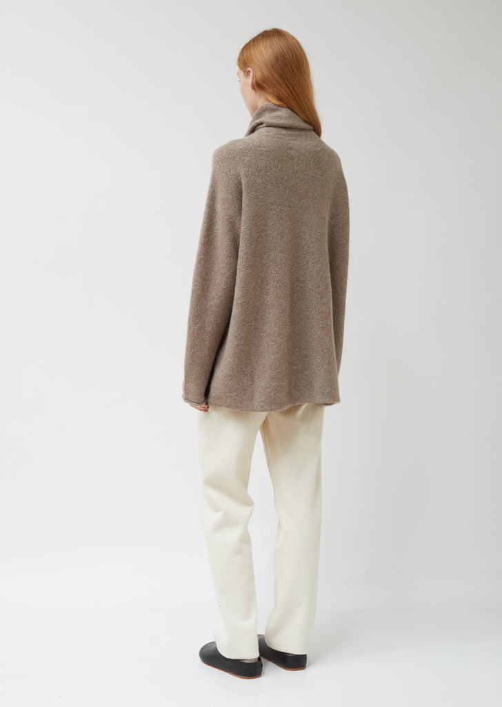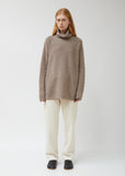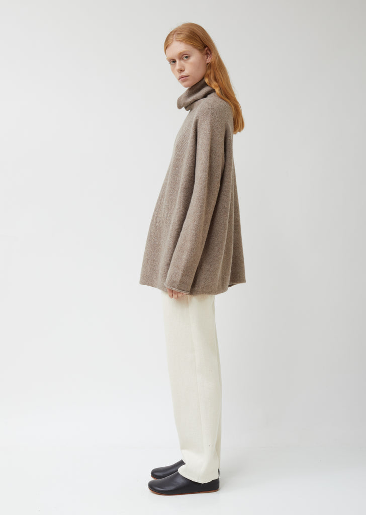 Long-sleeve cowl-neck sweater horizontally knitted from taupe super-fine baby-alpaca yarn. Hand-loomed. Seamless construction. Pulls over. Long rolled-edge sleeves. Slight high-low hem falls to upper thigh at front. Oversized fit.