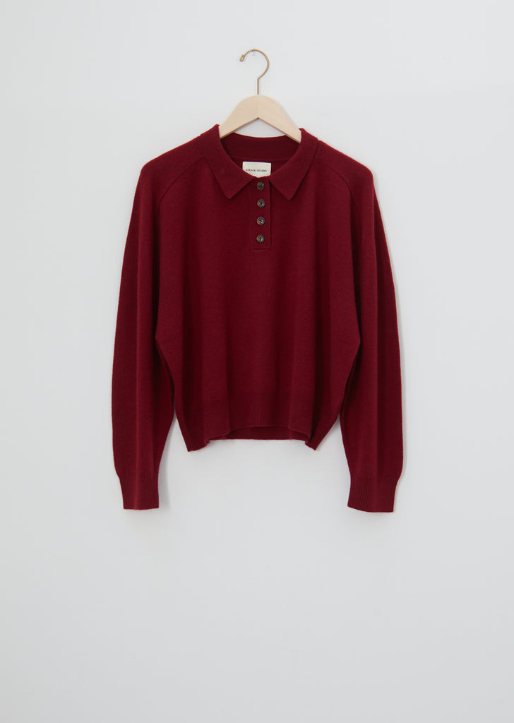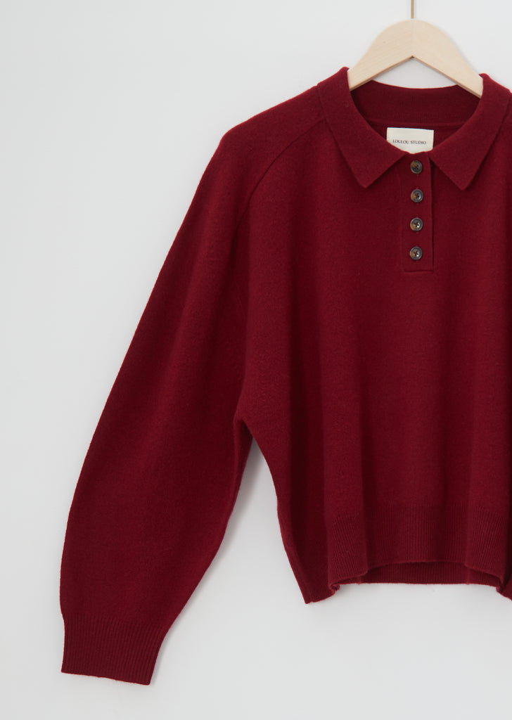 Loulou Studio Forana Cashmere Shirt in Bordeaux. Polo-style sweater with a cocoon fit in 100% pure cashmere. Features wider, loose sleeves on a dropped raglan armhole and finished with tortoise shell buttons.