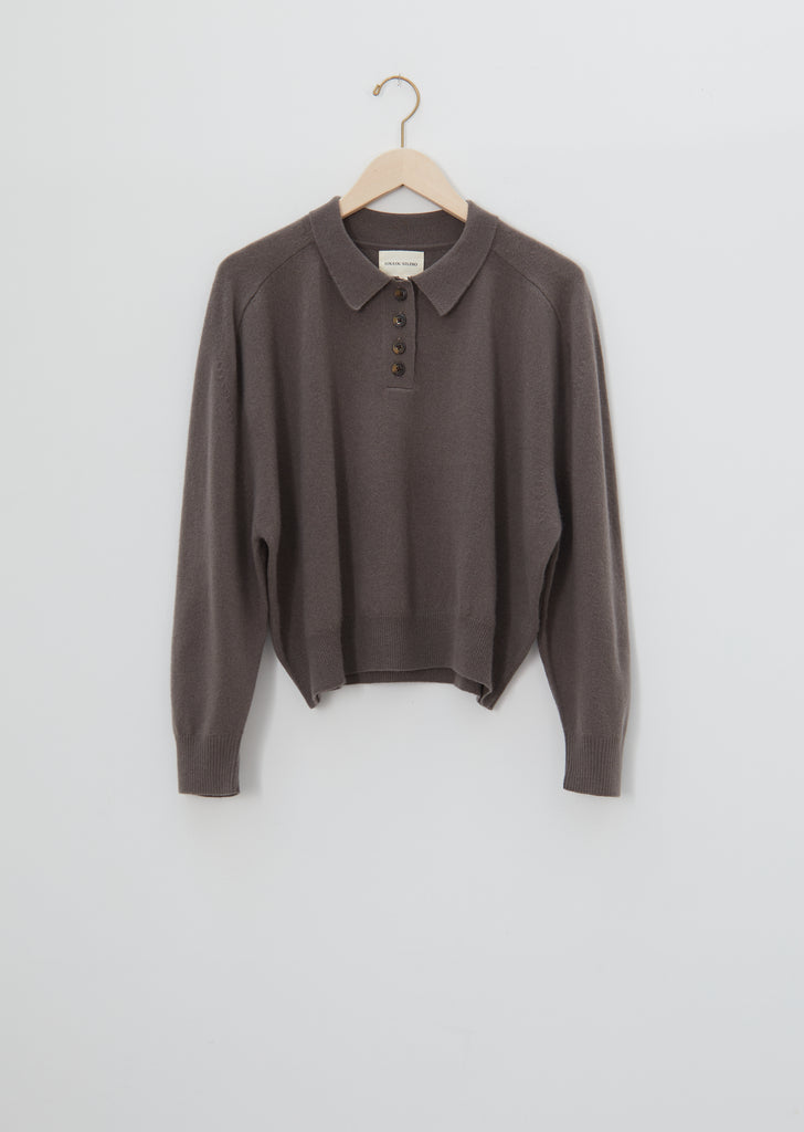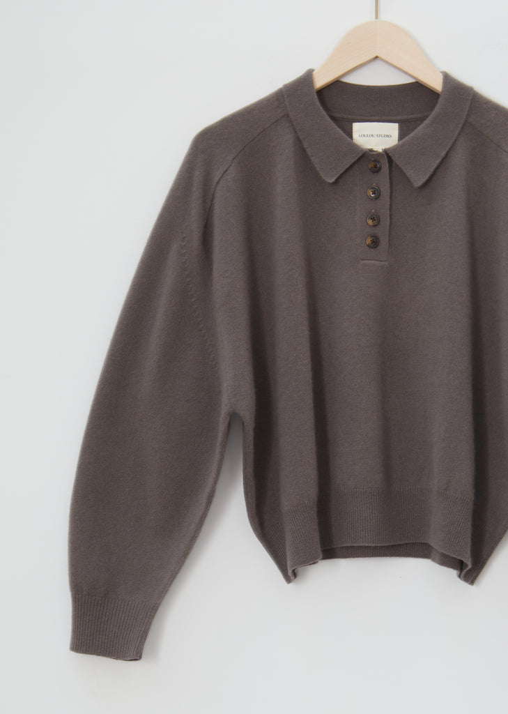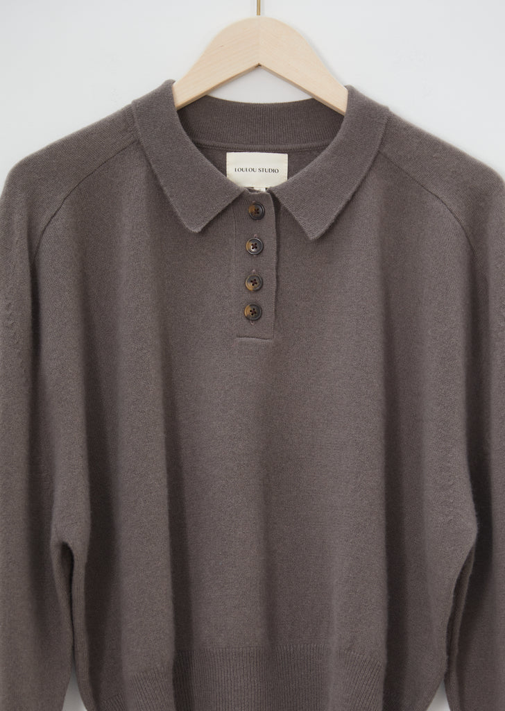 Loulou Studio Forana Sweater in Taupe. Polo-style sweater with a cocoon fit in 100% pure cashmere. Features wider, loose sleeves on a dropped raglan armhole and finished with tortoise shell buttons.