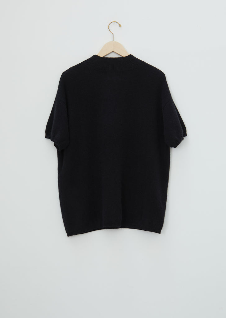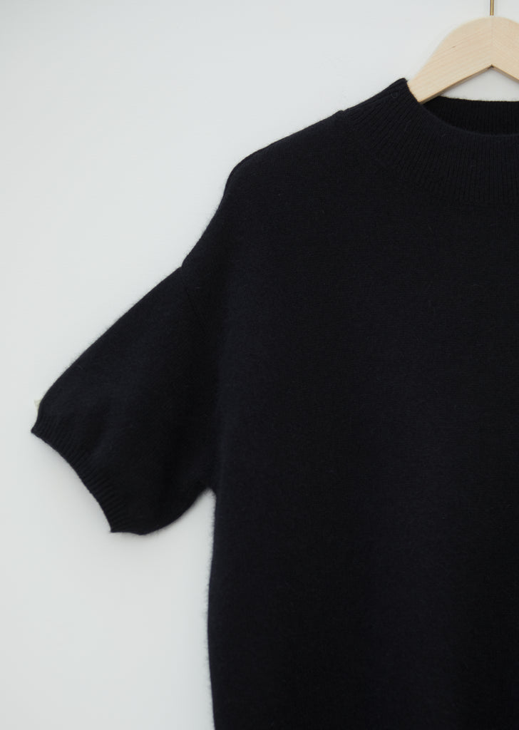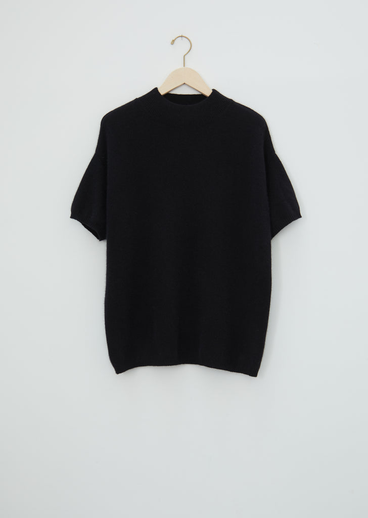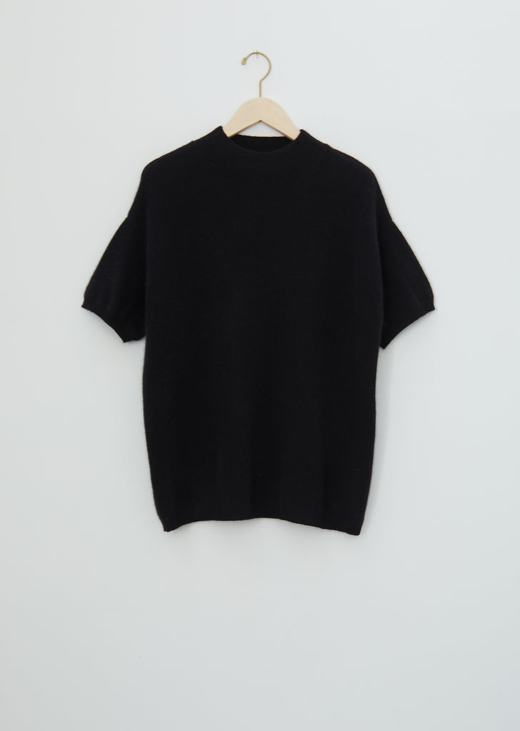 Loulou Studio Pertusato Wool Sweater in Black. Oversized wool blend sweater with a wide mock neckline and longer length. This easy to wear, versatile sweater features a small rib sleeve and hem.