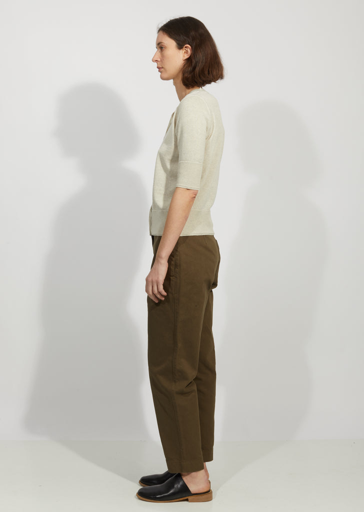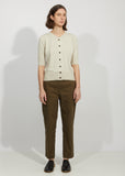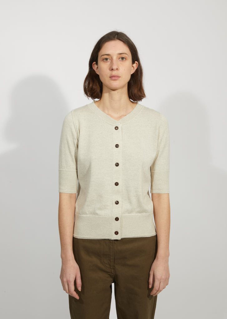 Beige button-front cardigan stockinette-stitched from worsted wool-cotton yarn, featuring a round neckline, half-sleeves, and fine-ribbed trims.