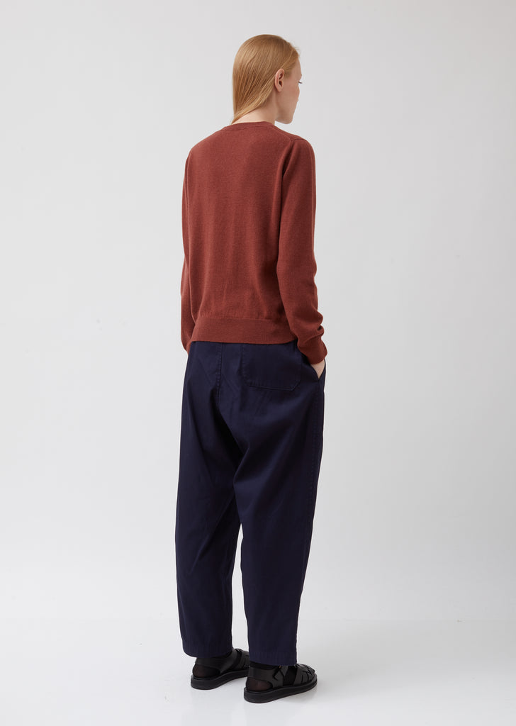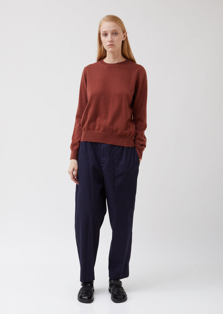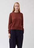Rust-tone mid-weight cashmere crewneck sweater in a slouchy silhouette. Pullover style. Fully fashioned long sleeves. Rib-knit neck, cuffs, and bottom band. Straight hip-length hem. Relaxed fit.