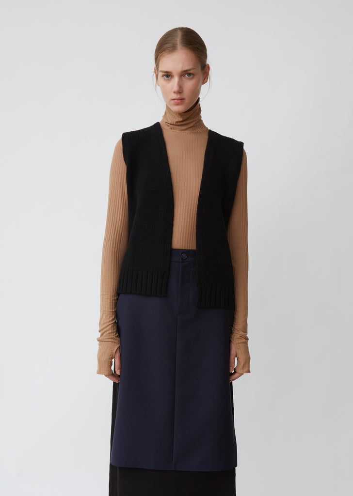 A basic-black sweater vest in a substantial (but breathable) five gauge—a neutral starting point for more experimental MM6 pieces. Straight fit. Sleeveless. Generous armholes. Open, closure-less front. Ribbed straight hem. Color: Black. 50% Wool, 50% Acrylic. Dry clean/Hand wash. Imported.