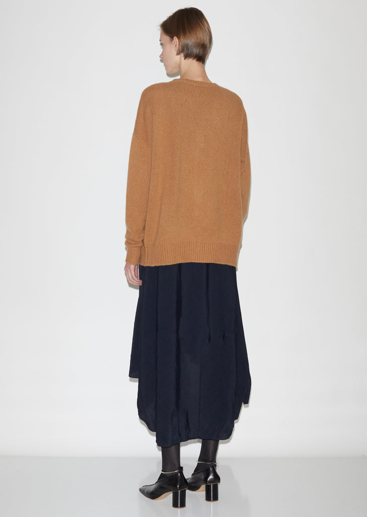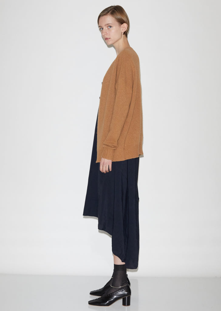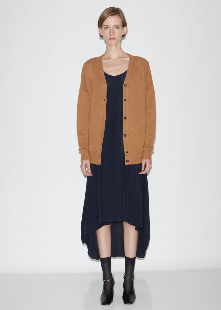 Deep camel cozy cardigan in soft upcycled medium-gauge cashmere with a hint of wool.