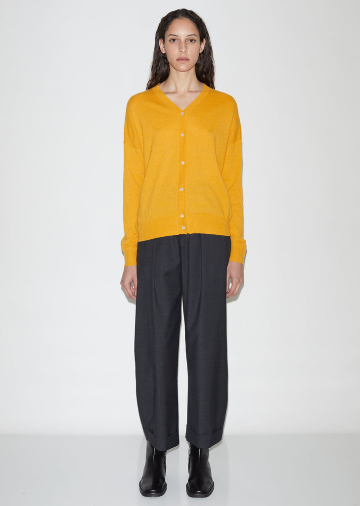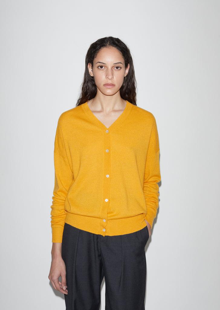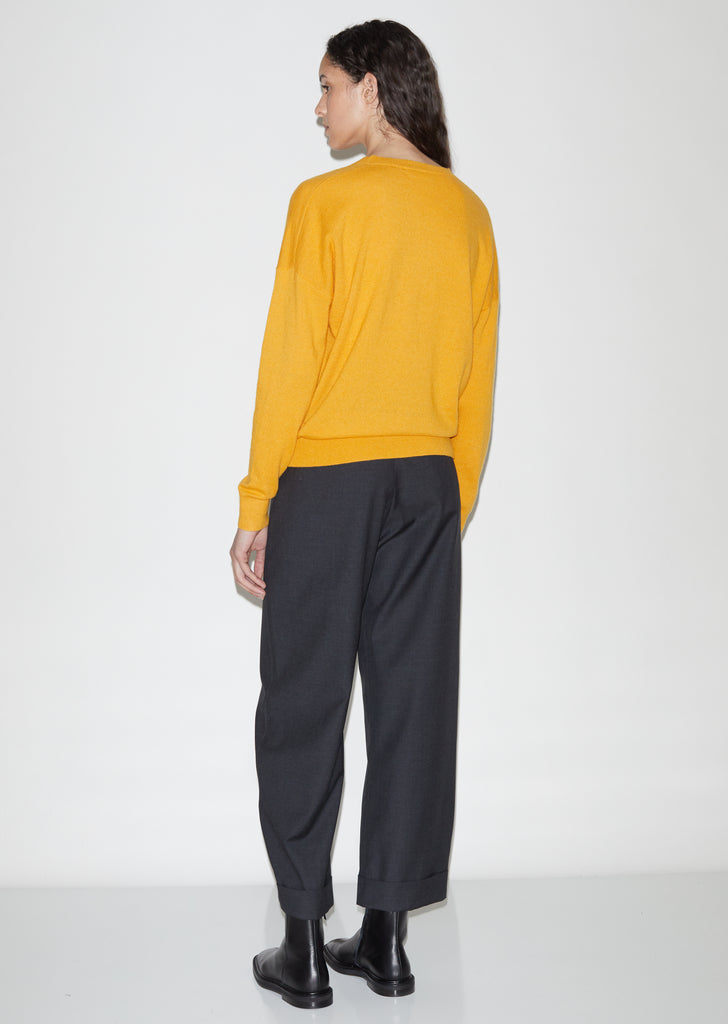 Tangerine cardigan-sweater in upcycled wool and cashmere yarn. Can be worn as cardigan or sweater. A signature piece from the label and a versatile piece for year round.
