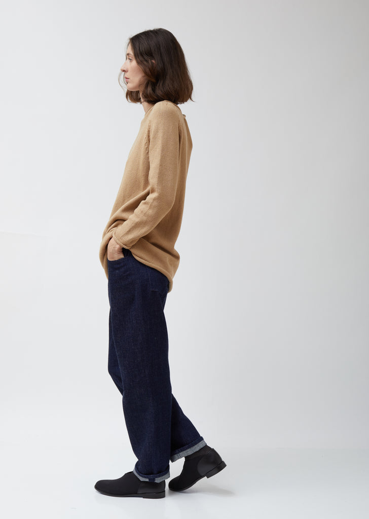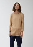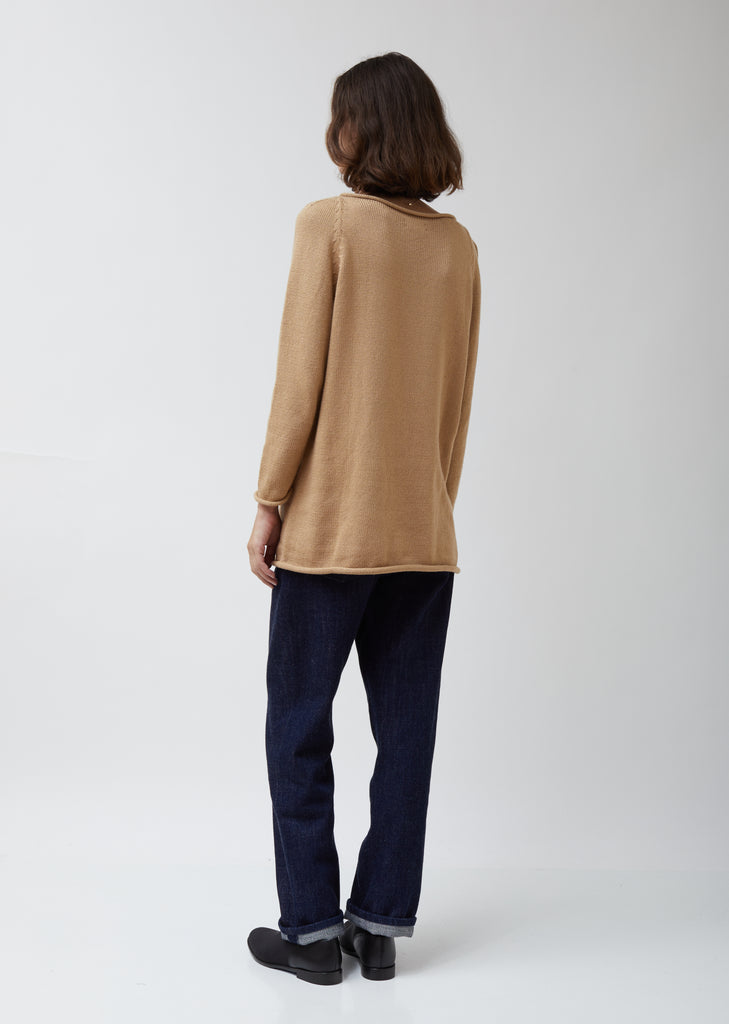 Long-sleeve knit sweater stockinette-stitched from camel-shade worsted pima-cotton yarn, finished with a rolled-edge boatneck, cuffs, and hem. Pullover style. Elongated straight hem falls to upper thigh. Straight, relaxed fit.