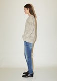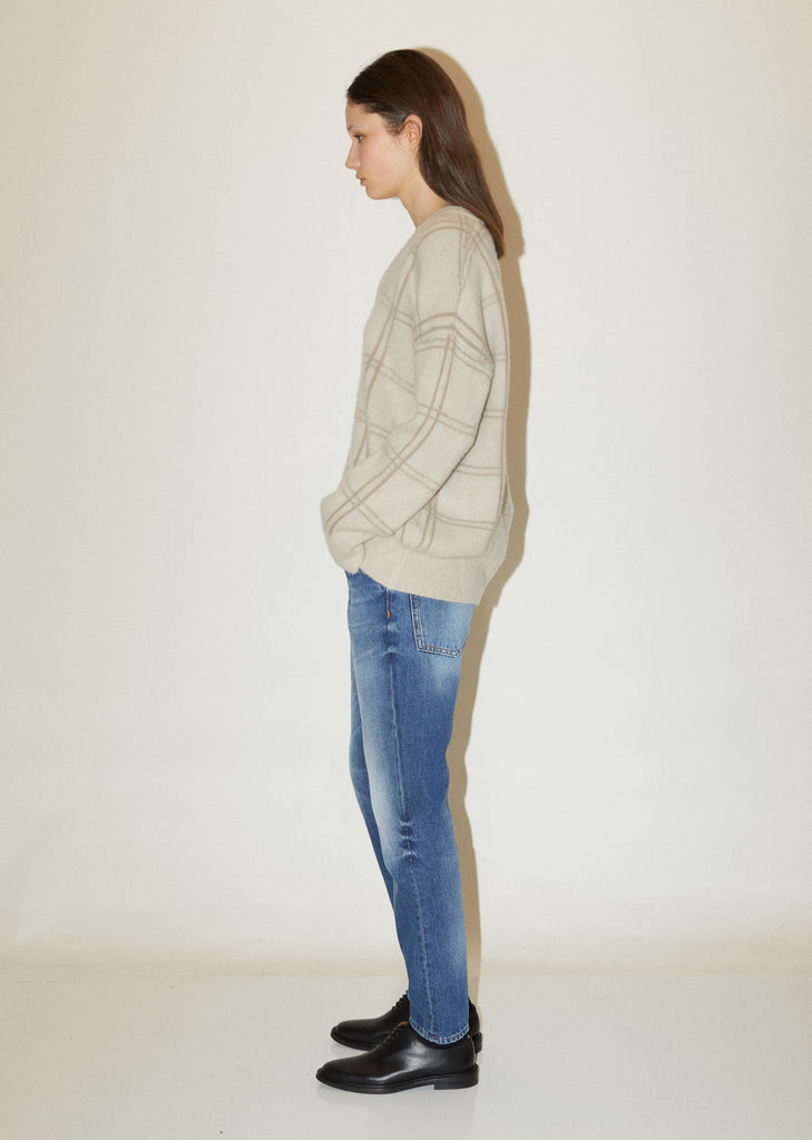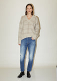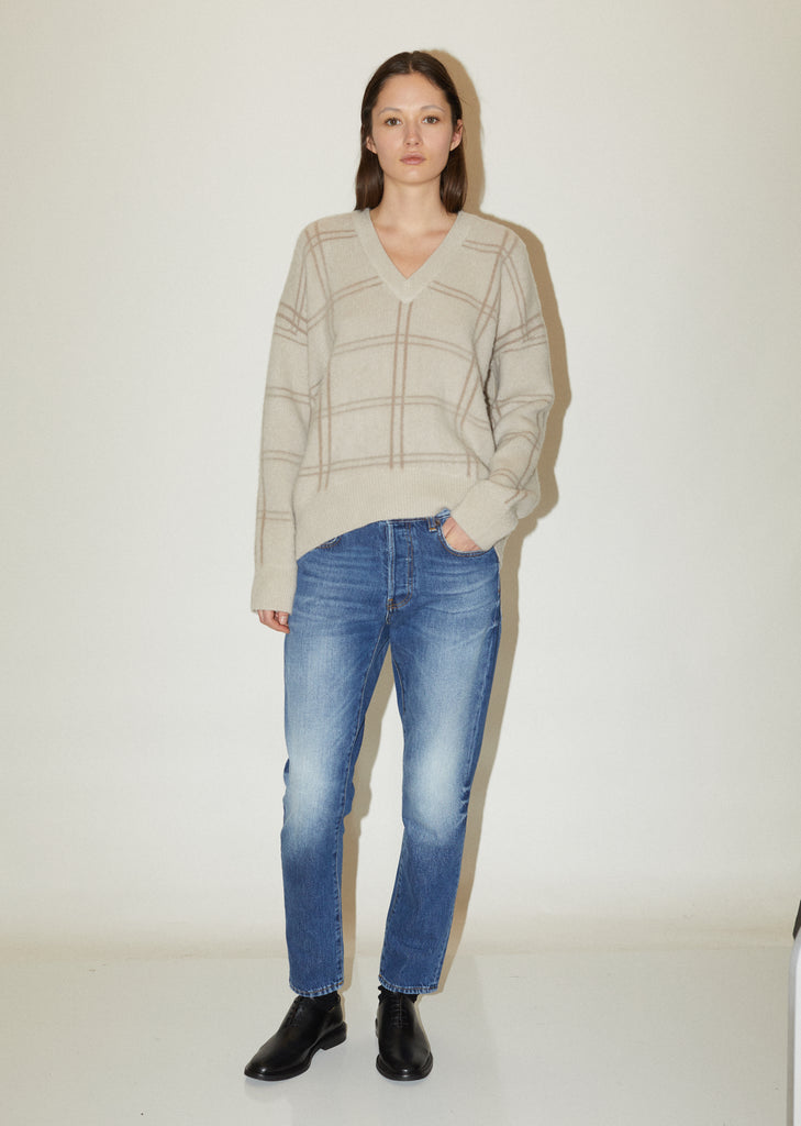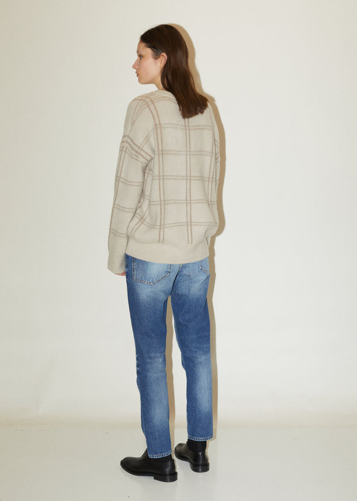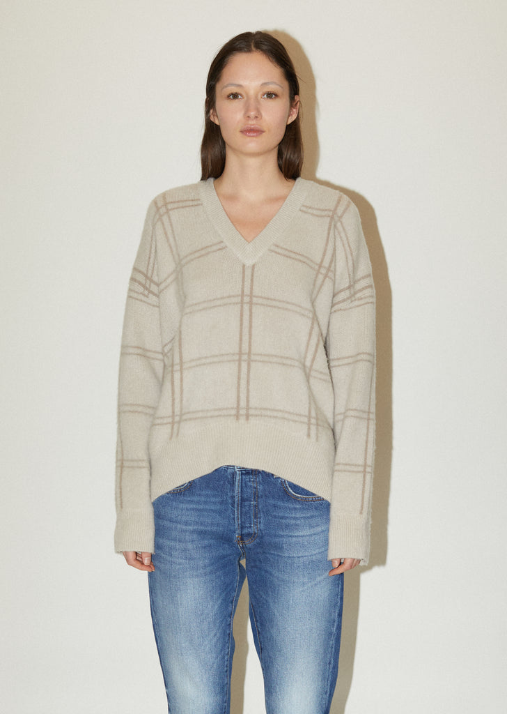 Luxurious oatmeal-grey brushed-cashmere sweater with a windowpane check pattern. V-neck with chunky rib-trim. Finished with rib trim cuff and hem. Oversized fit.
