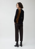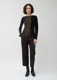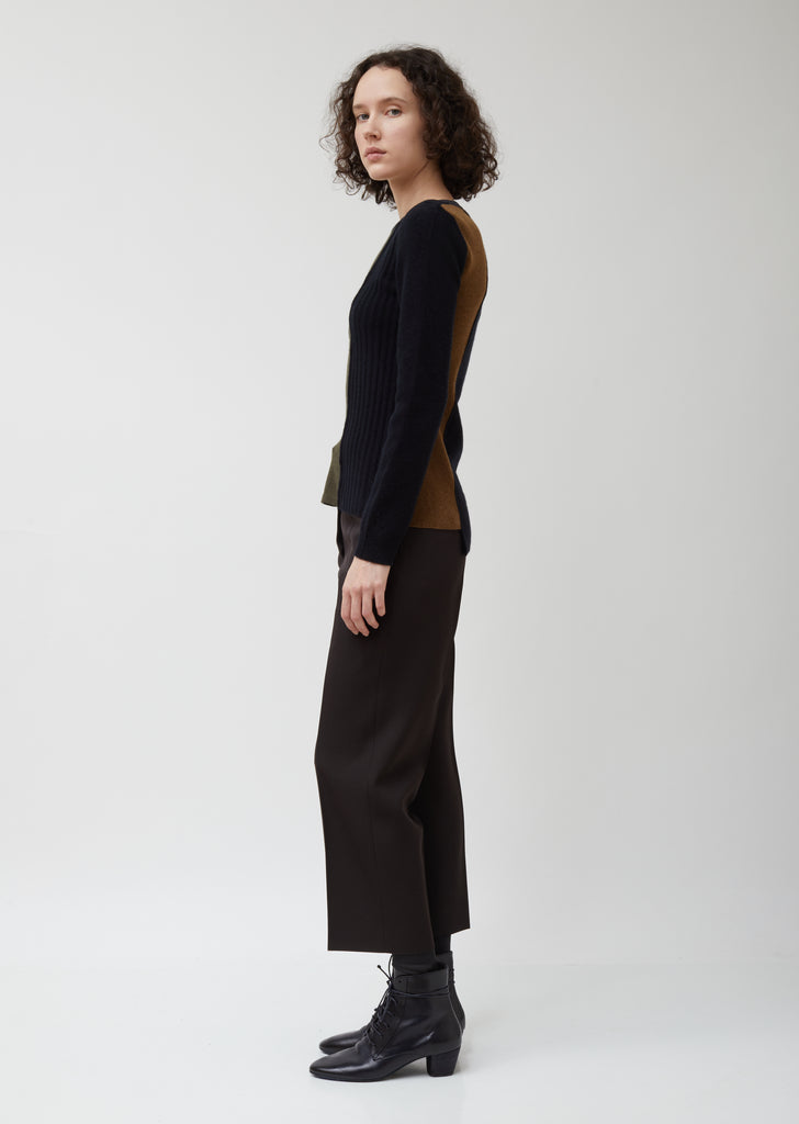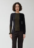 Long-sleeve crewneck sweater constructed from multiple knitted panels of wool-cashmere yarn, in neutral tones ranging from grey and navy to khaki brown and petrol. Rib and stockinette stitched. Pullover style. Long sleeves; lettuce-edge cuff at right. Asymmetric, split, and extended front hem. Asymmetric, extended back hem. Hem falls to upper hip. Fitted silhouette.