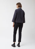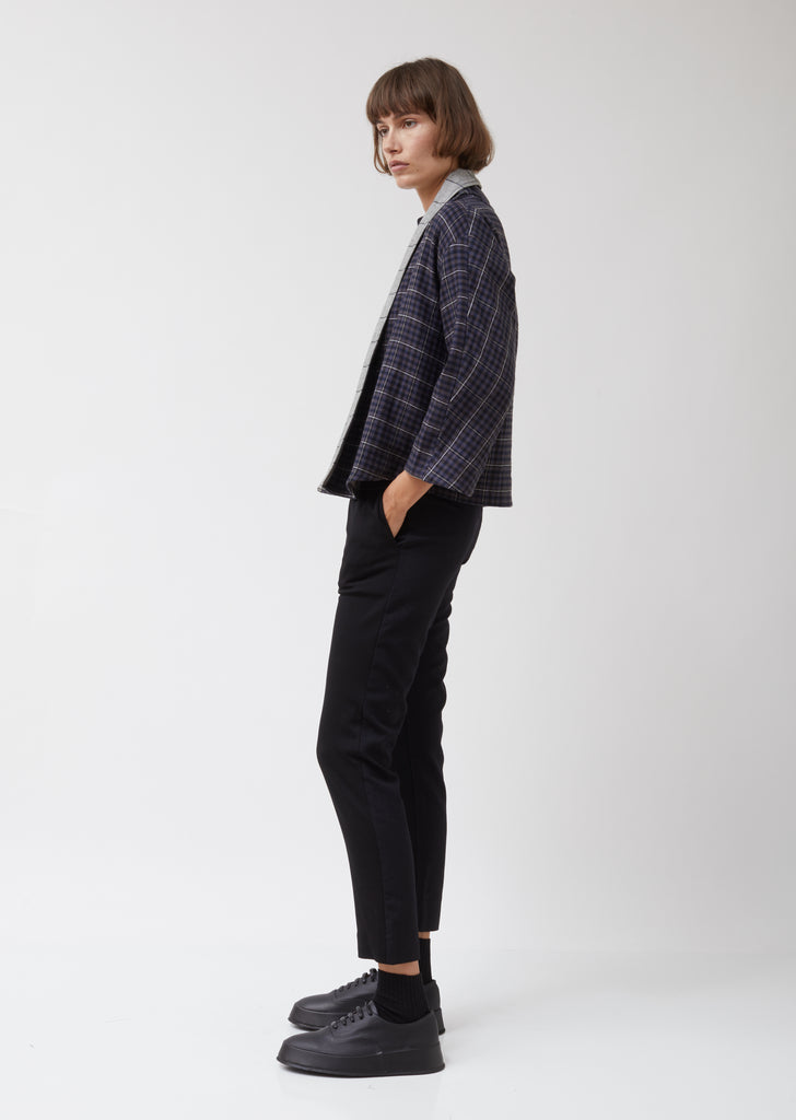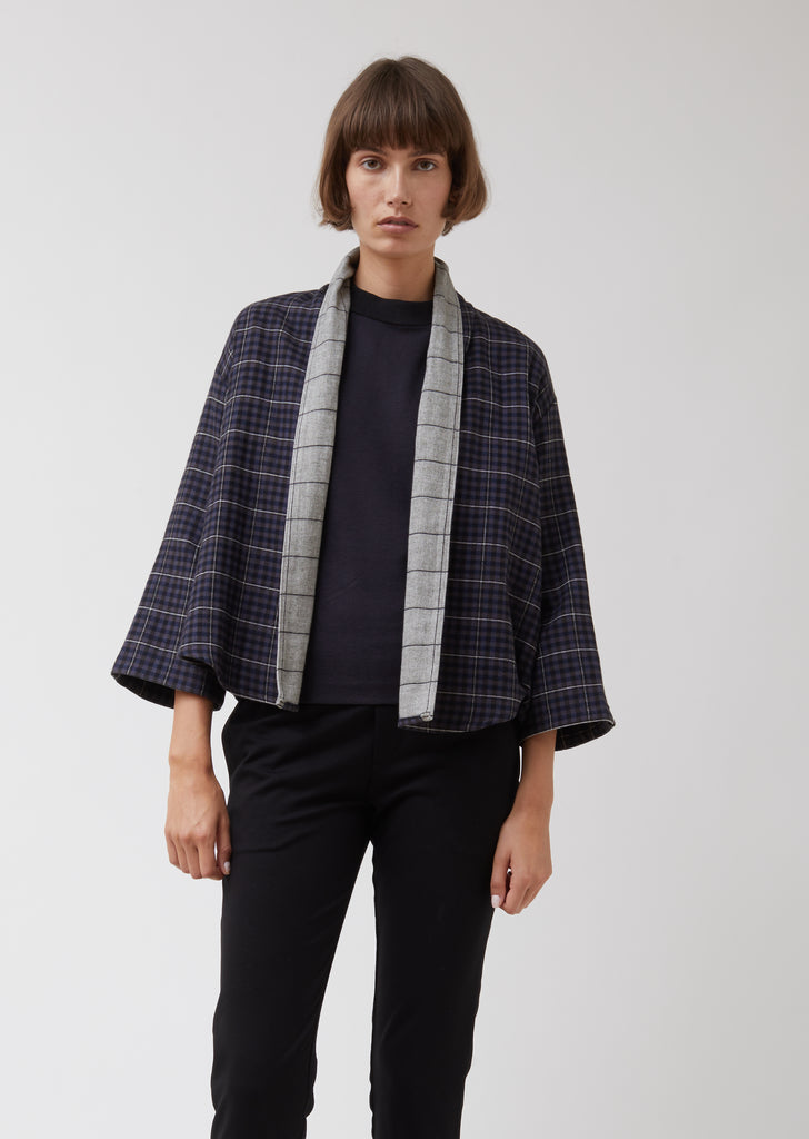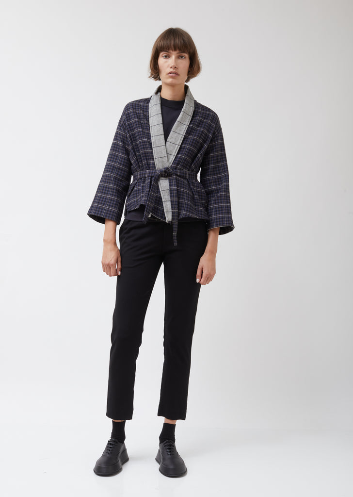 Belted cotton wrap cardigan in a cropped silhouette, imagined in a purple-black-and-white check pattern, with cotton lining in a grey-and-black windowpane check. Shawl collar. Bracelet sleeves. Coordinating sash belt. Cropped at high hip. Boxy silhouette when unbelted.