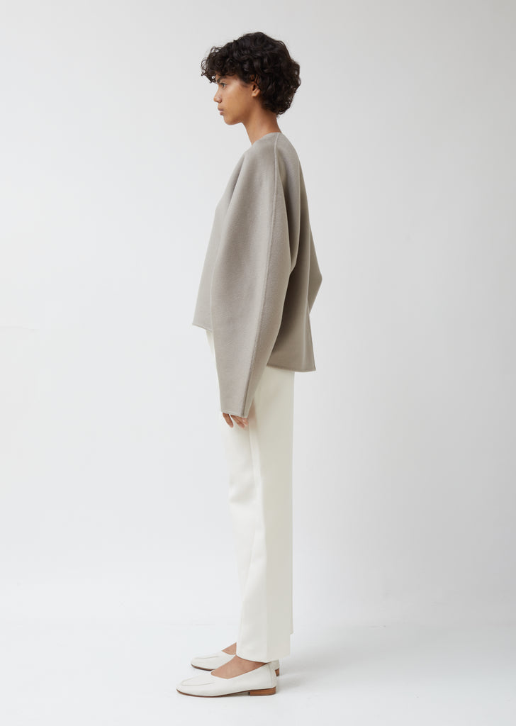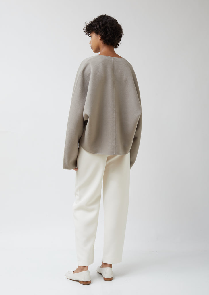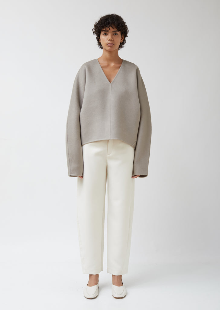 Knitted deep-V-neck wool popover crafted from elephant-grey brushed wool-cashmere blend. Paneled construction. Pulls over. Elongated dolman sleeves. Raised-seam details. Curved, high-low hem falls to upper hip at front. Relaxed fit.