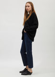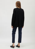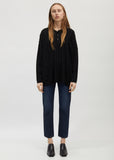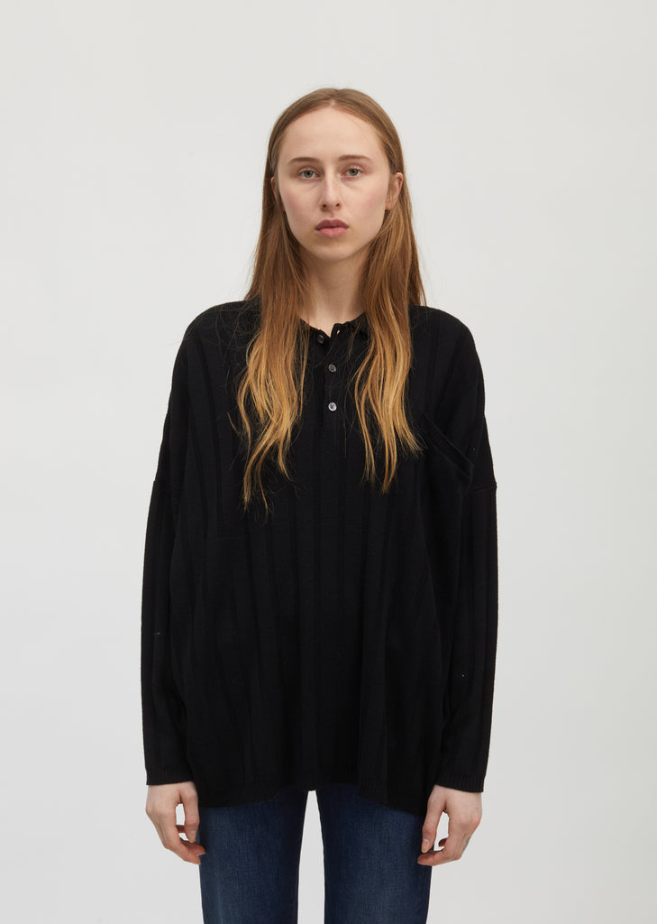 Mustard-mélange “granddad” sweater in merino wool, featuring extra-wide ribbing, a polo neckline, and dolman-silhouette sleeves.