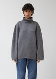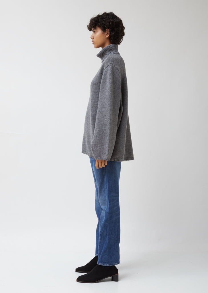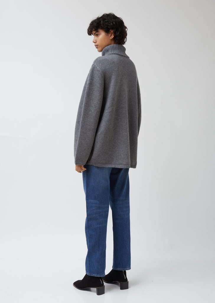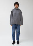 Oversized turtleneck sweater stockinette-stitched from grey-mélange merino-cashmere yarn. Pullover style. Long wide sleeves. English-rib-stitched turtleneck, cuffs, and bottom band. Straight hem falls to upper thigh. Generous fit.