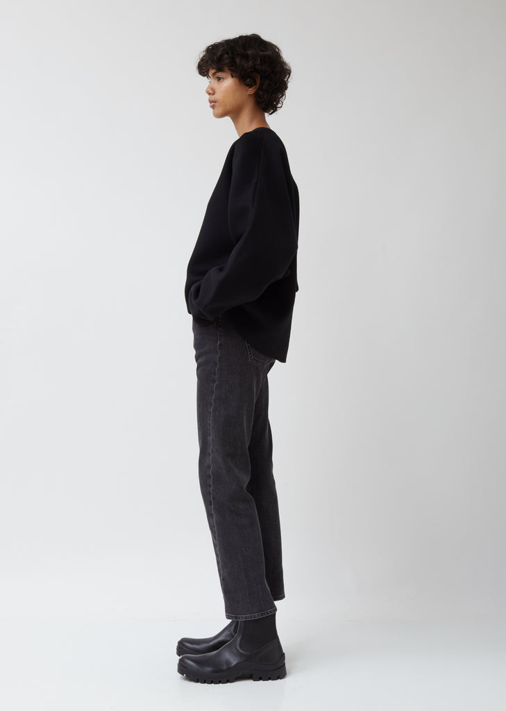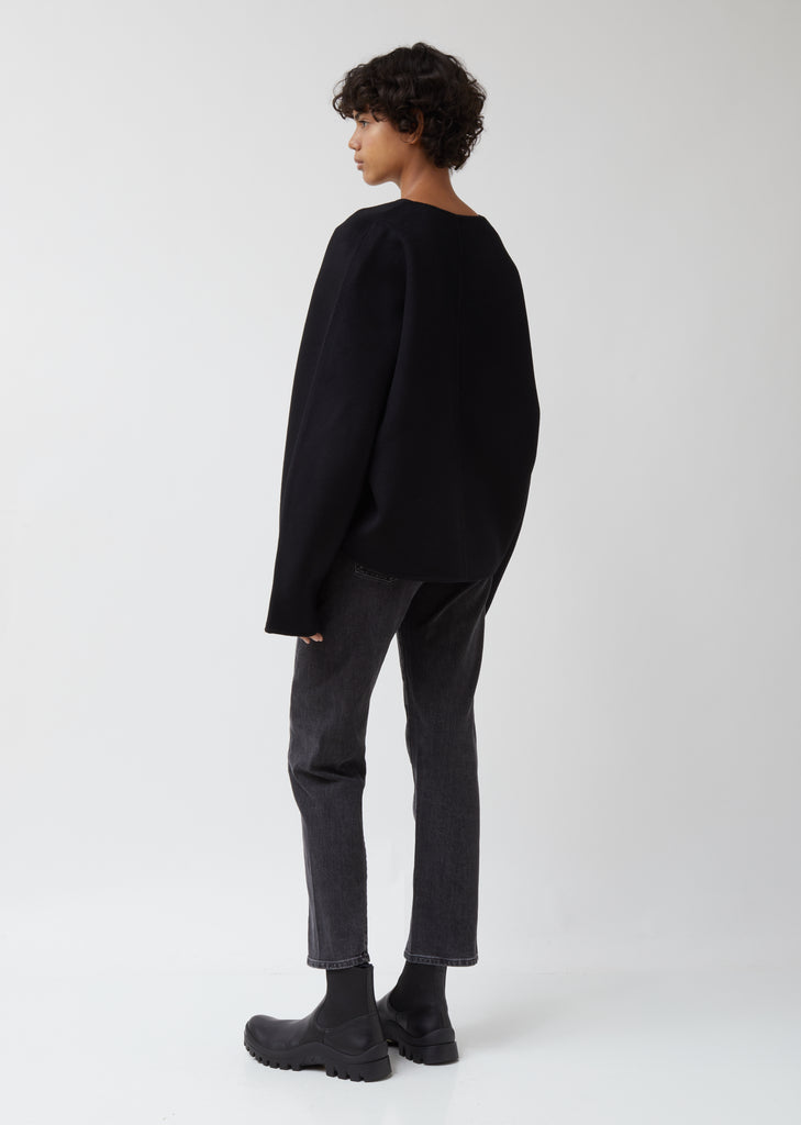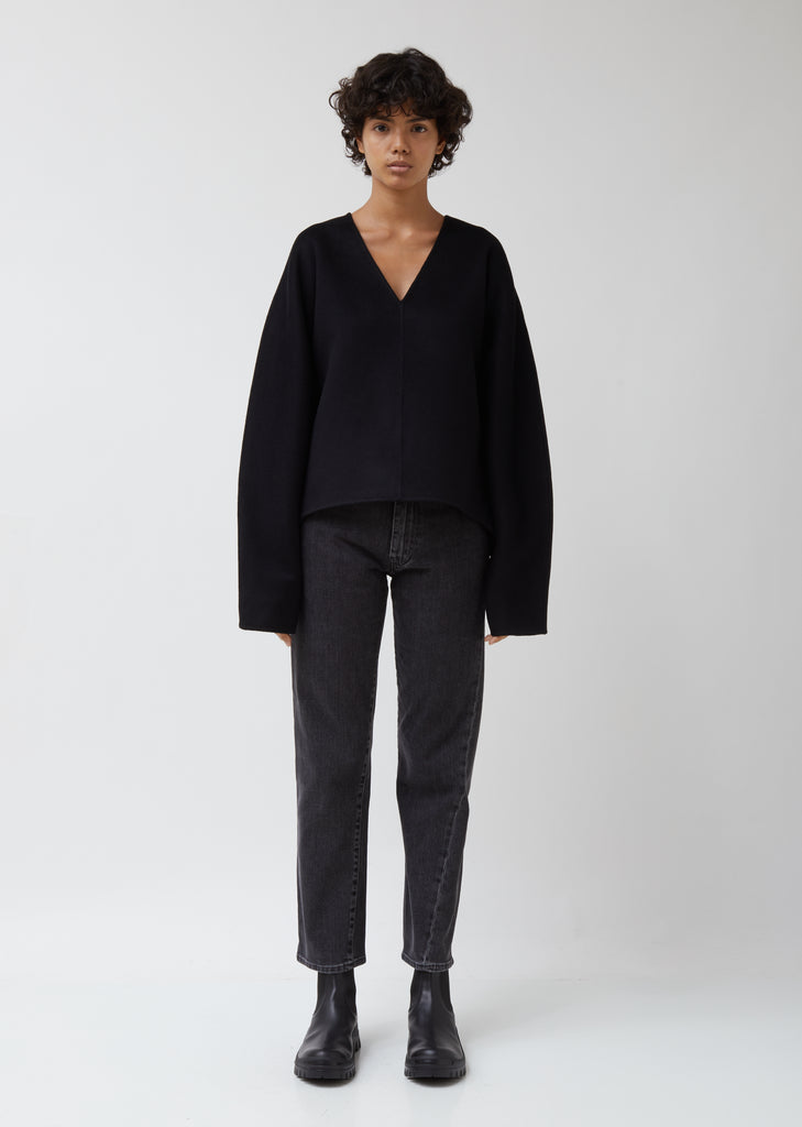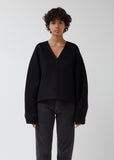 Knitted deep-V-neck popover crafted from black brushed wool-cashmere blend. Paneled construction. Pulls over. Elongated dolman sleeves. Raised-seam details. Curved, high-low hem falls to upper hip at front. Relaxed fit.