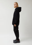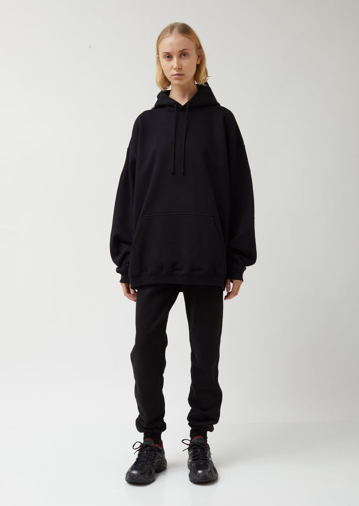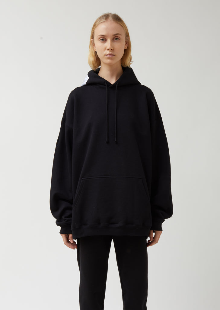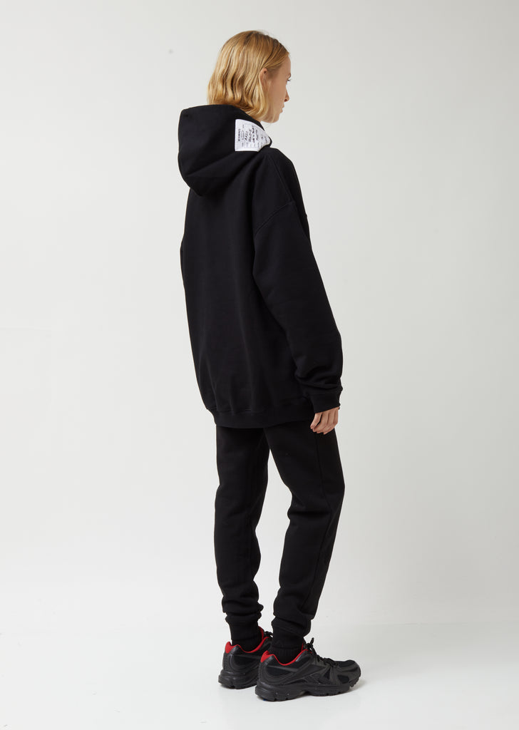 Roomy hooded sweatshirt in black cotton fleece, finished with an oversized stitched-on clothing tag at the right side of the hood. Pulls over. Drawstring hood. Drop shoulders. Long cuffed sleeves. Darting at upper sleeves. Kangaroo pocket at waist. White clothing tag with black text provides a description of the garment. Straight hem falls to upper thigh. Oversized fit.