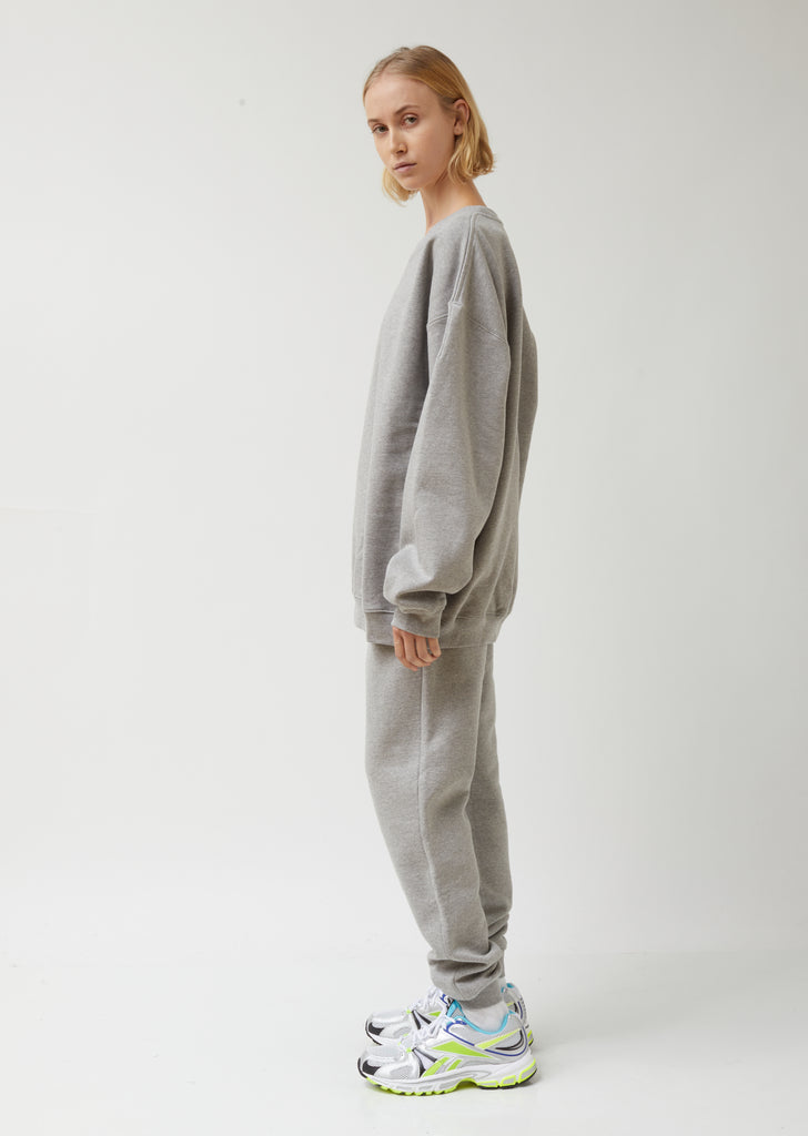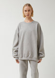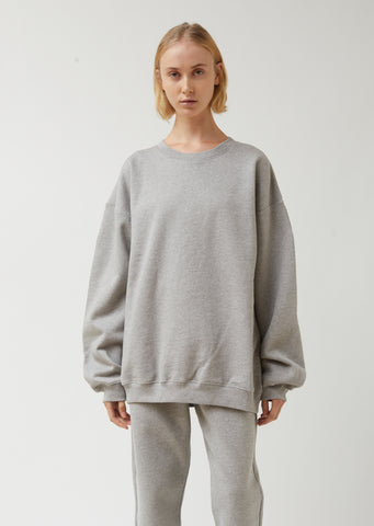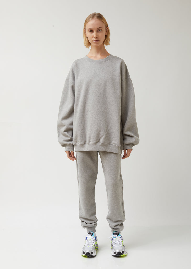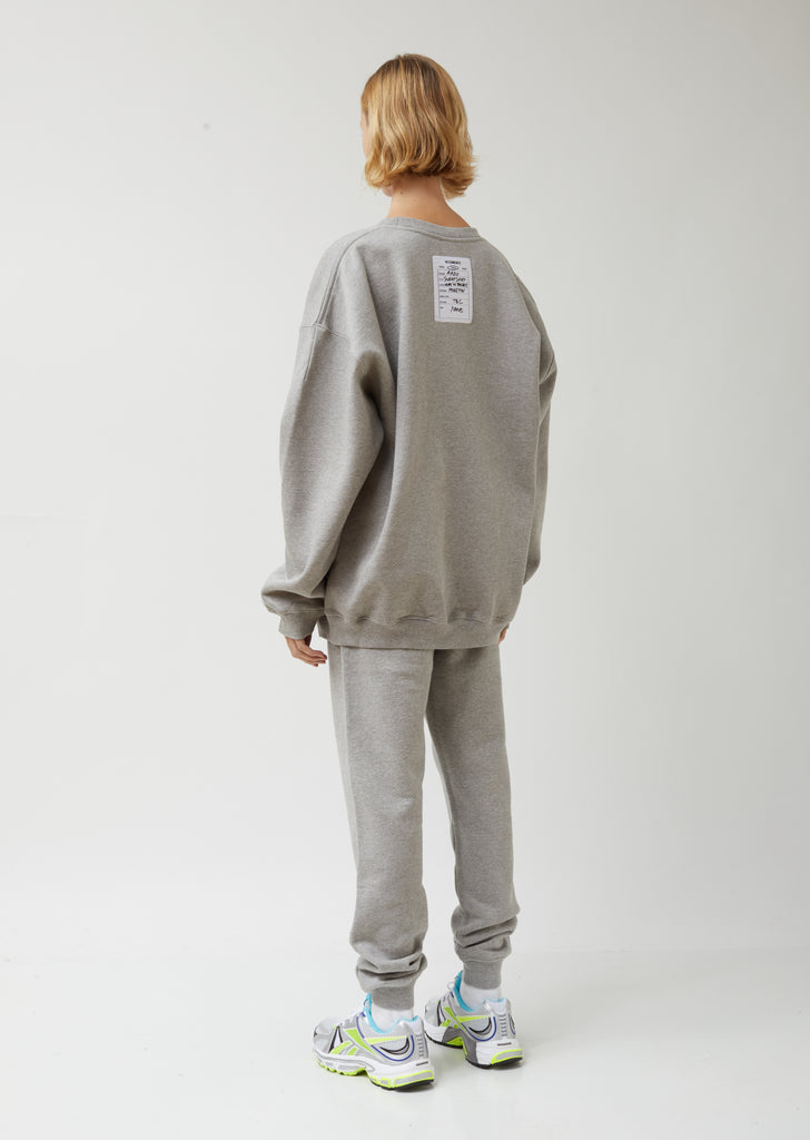 Oversized long-sleeve sweatshirt imagined in light-grey cotton fleece, finished at the upper back with an oversized stitched-on clothing tag. Unisex style. Pulls over. Crewneck. Drop shoulders. Exaggerated sleeves. Darting at upper sleeves. White-and-black clothing tag provides a description of the garment. Straight hem falls to upper thigh. Straight, relaxed fit.