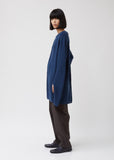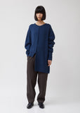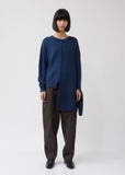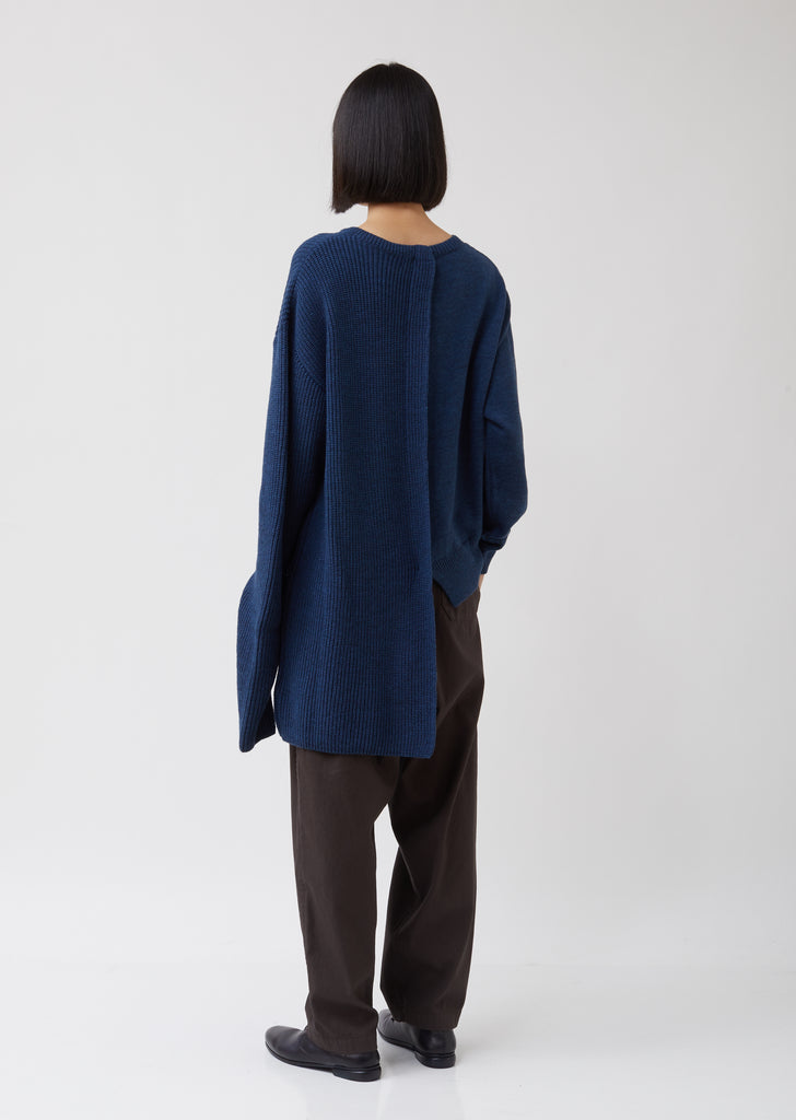 Navy sweater made from two contrasting wool blend knit panels—one fine-gauge, one wide-gauge—that meet in the center. The wide-gauge panel is significantly longer, lending asymmetry and draped dimension. Rib-knit jewel neckline. Long sleeves. Dropped shoulder, longer sleeve, and thigh-length hem on left side. Rib-knit cuff and shorter hem on right side. Oversized fit.