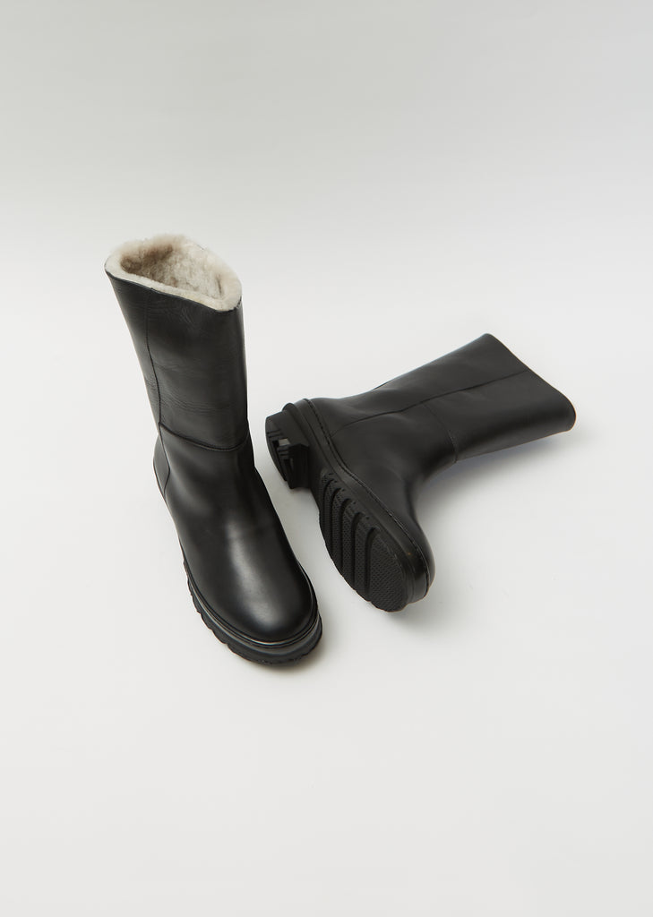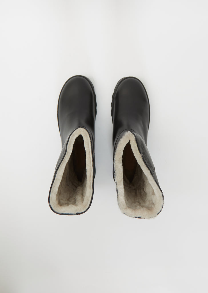 Legres new mid-calf garden boot in oiled calf leather lined in contrast cream shearling on a lug rubber sole.