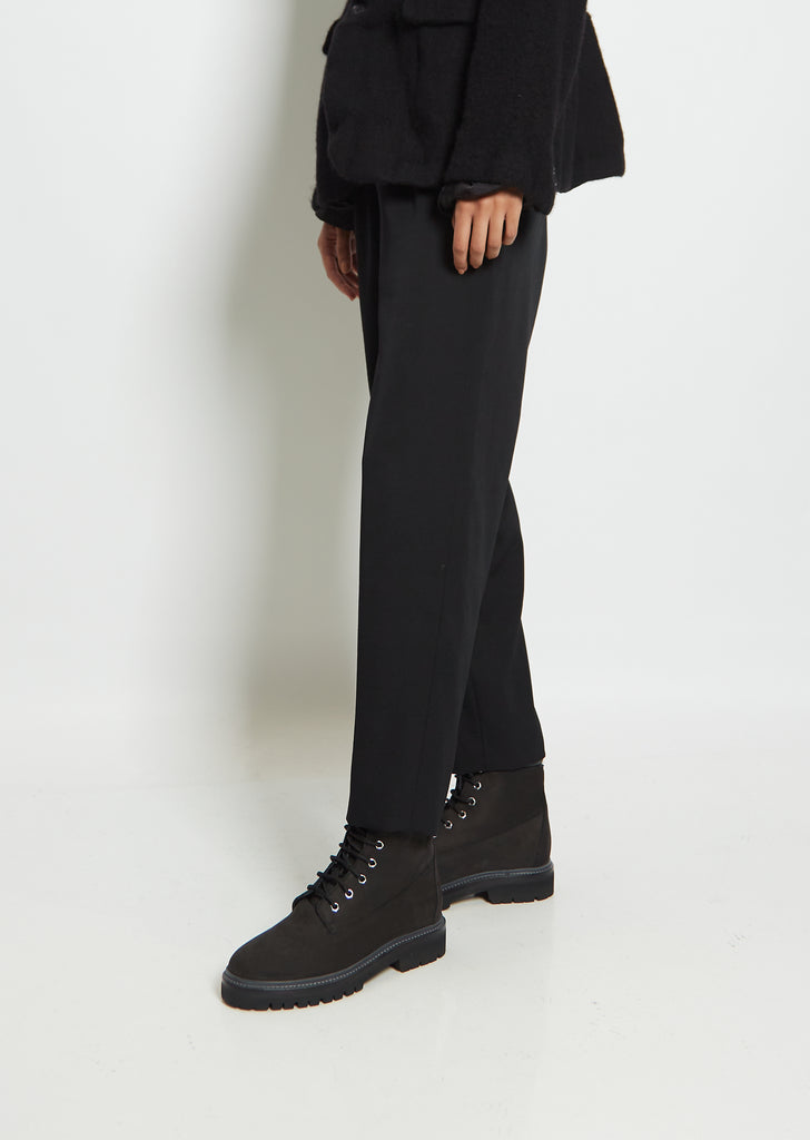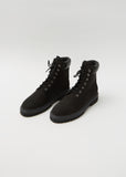 Legres hiking boot inspired front lace-up ankle boot in black nubuck leather with padded smooth leather cuffs on a treaded rubber sole.