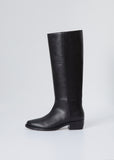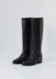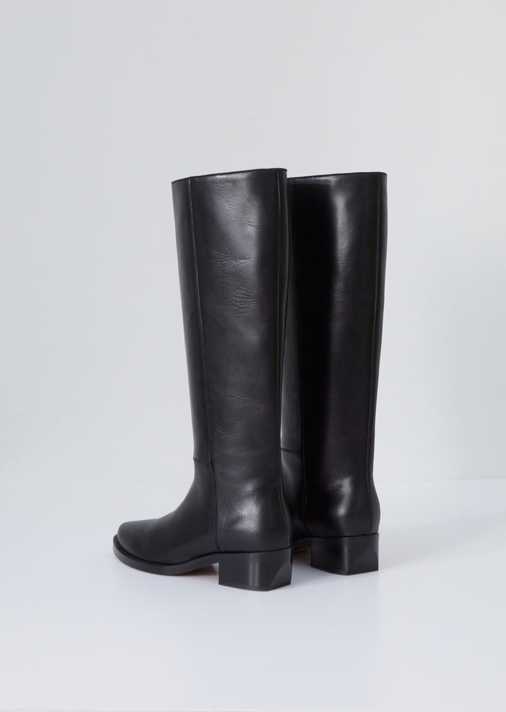 New Designer — Legres Riding Boot in Black. Almond toe knee-high boots in nappa leather with a traditional stacked heel.