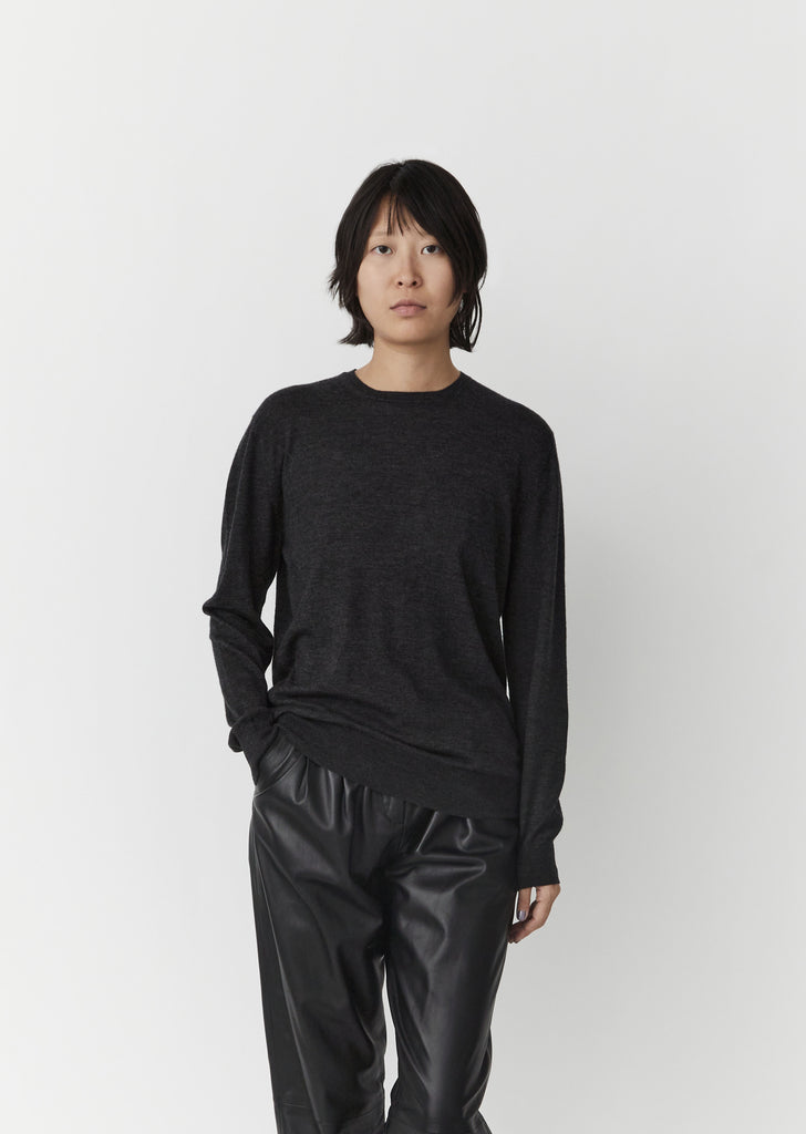 FW'20 Collection — Loulou Studio Songe Wool & Cashmere Sweater in Black Melange. Dark grey lightweight wool and cashmere sweater with a slim ribbed neckline and slit detailing at sleeve cuffs. Finished with a rib trim hem.