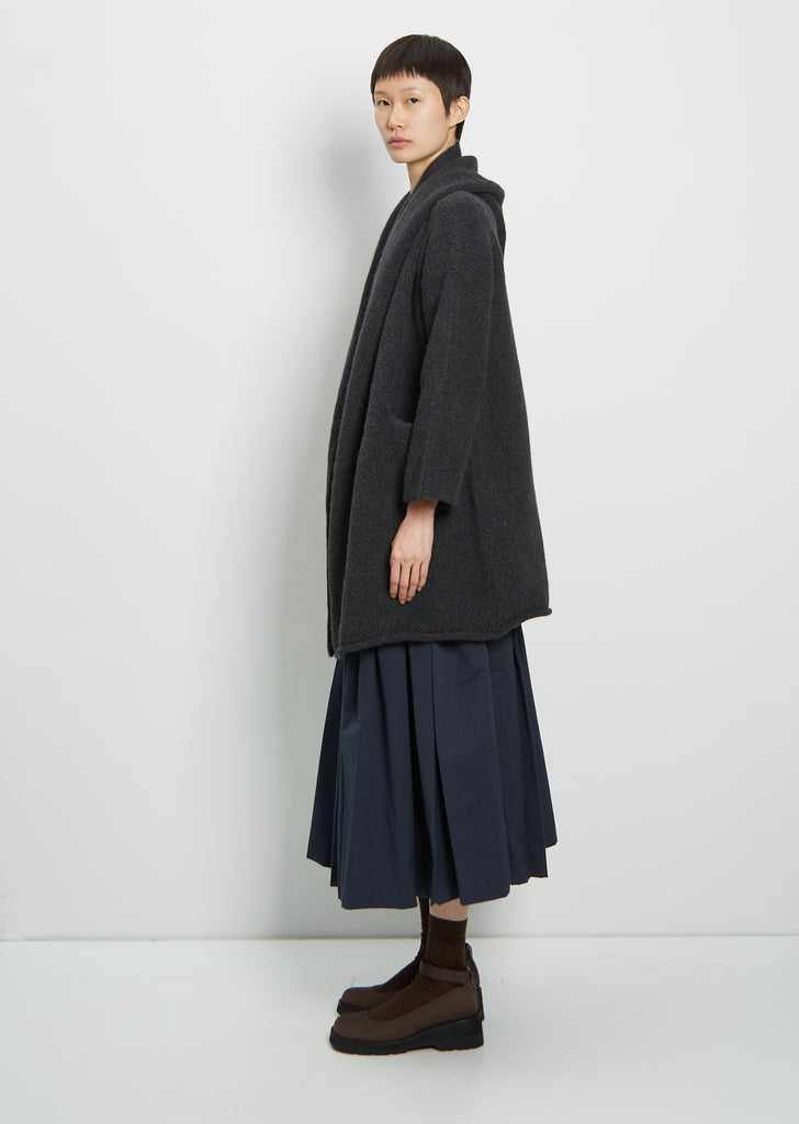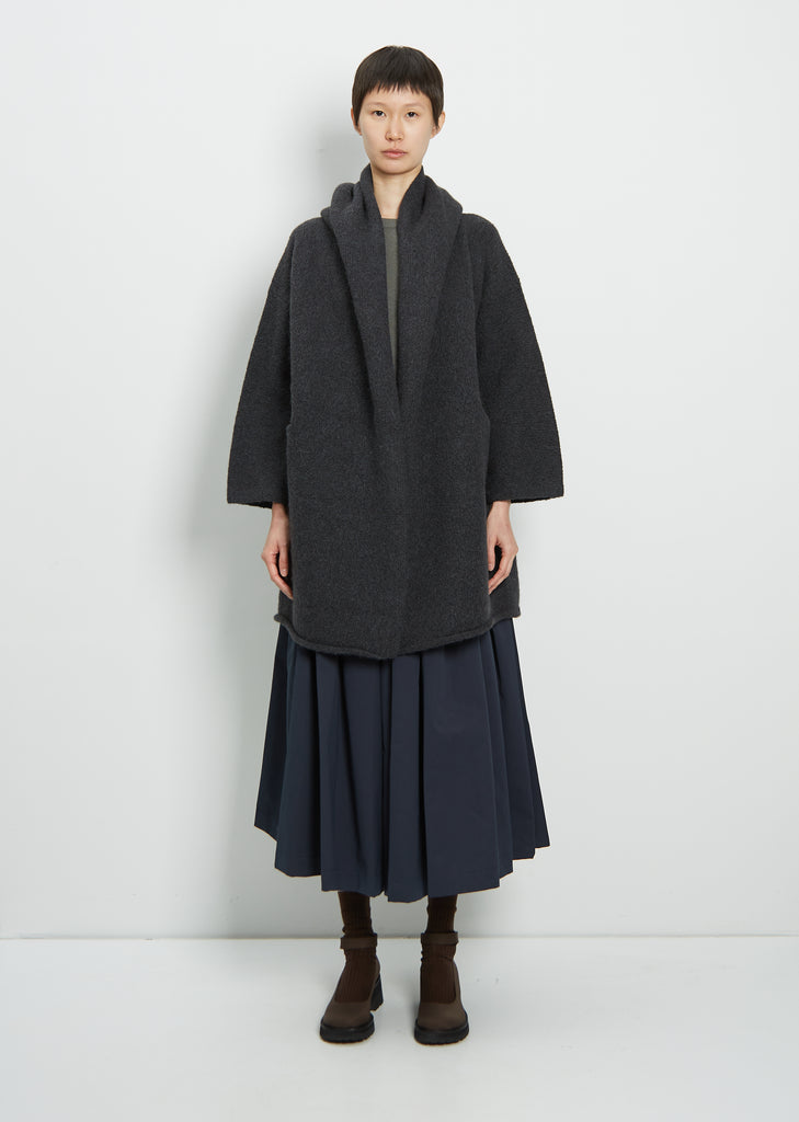 Lauren Manoogian signature Capote coat in ink grey. Knitted in felted alpaca knit with slight stretch, this versatile sweater coat features a hood, dropped shoulders and self-lined front slit pockets. Finished with a rolled hemline. Soft cocoon silhouette with an oversized fit.