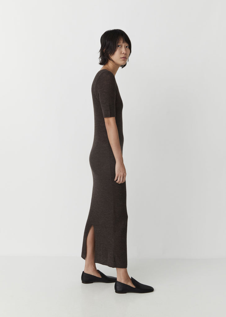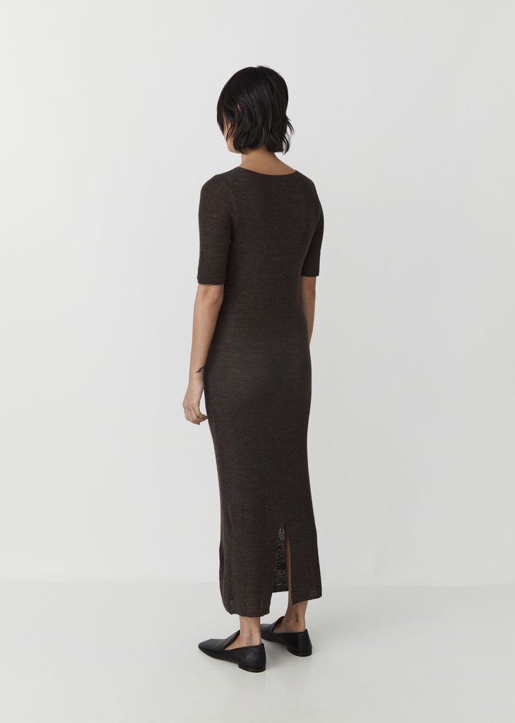 FW'20 Collection – Lauren Manoogian Rib Tee Dress in Raku. Brand signature knitted tee dress with extended short sleeves and back vent in a dark brown melange.