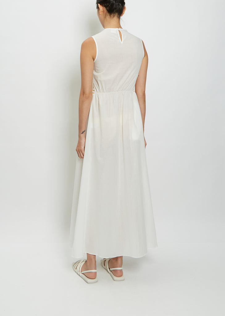 Loretta Caponi white sleeveless tank dress with an intricately two-toned orange embroidered and pleated elastic smoked bodice in a lightweight gauze cotton. Also available in Capri.