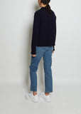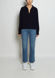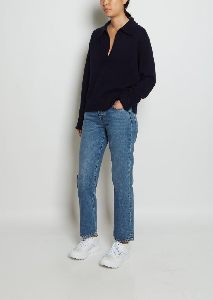 Lisa Yang v-neck polo sweater with a pointed collar in an ultra-soft navy cashmere knit. Features rib trim finish at the neck placket, sleeves and hem.