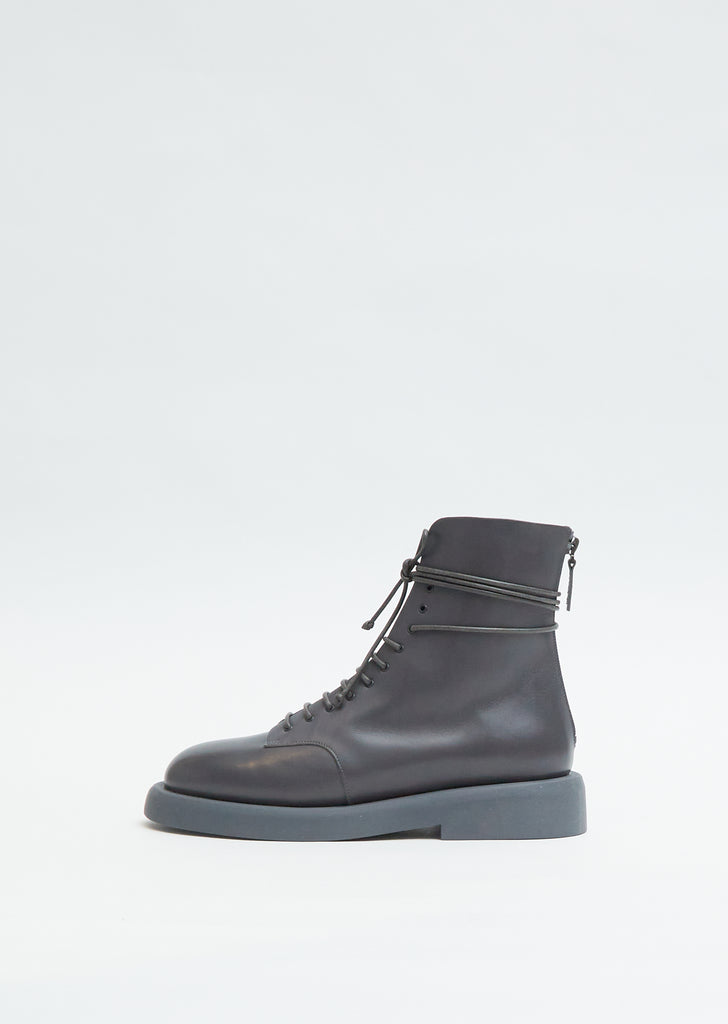 Marsèll Gomme signature lace-up combat boot in a dark grey leather grounded on a tonal rubber platform sole. Back zipper closure. Heel measures approximately 1.5".