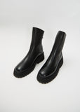 Marsèll Carro ankle boot with an angled ankle opening in black smooth calf leather. Features a back ankle zipper and chunky treaded sole.