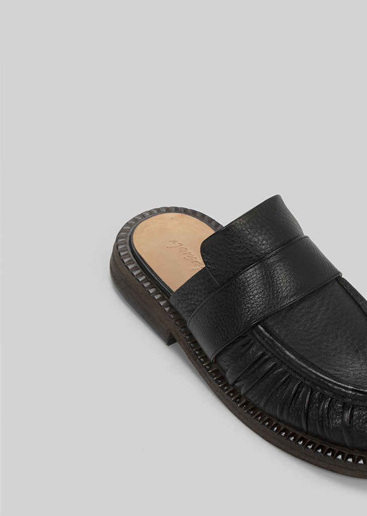 Marsèll signature Alluce loafer mules in black. Handcrafted in Italy with full grain leather, this slip on style features a round toe and stacked tonal heel. Fully lined in contrast beige leather.