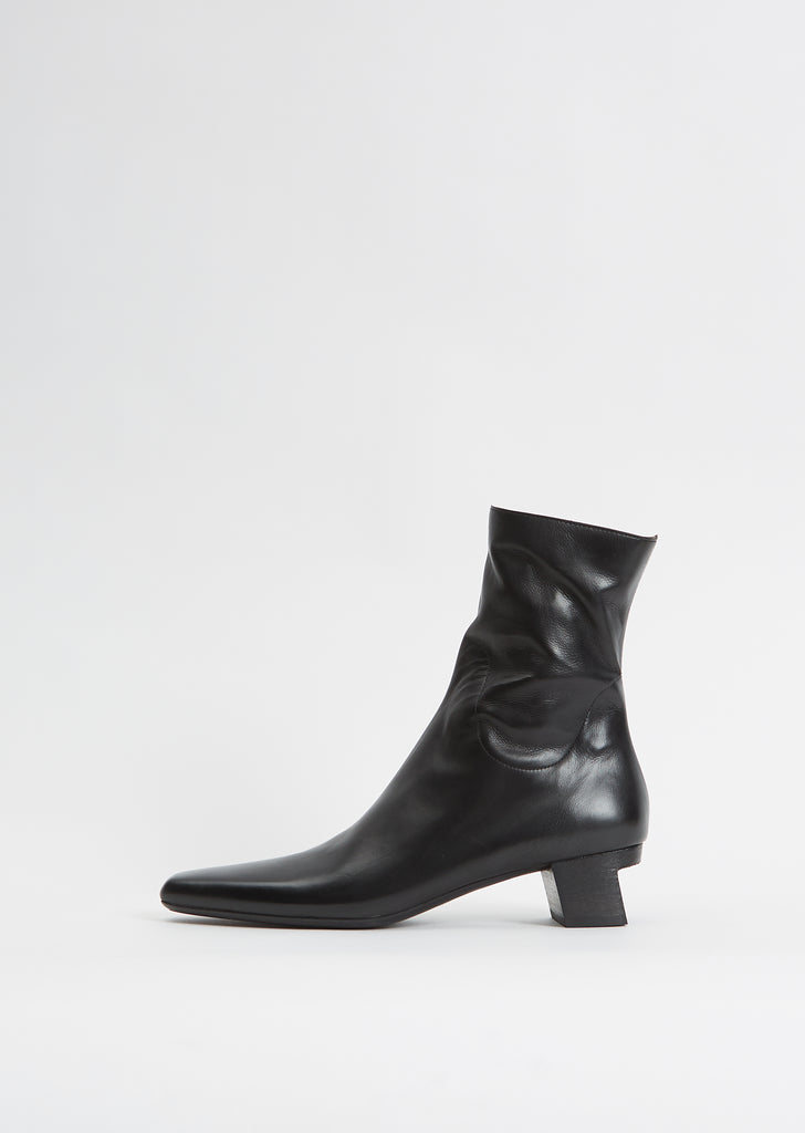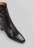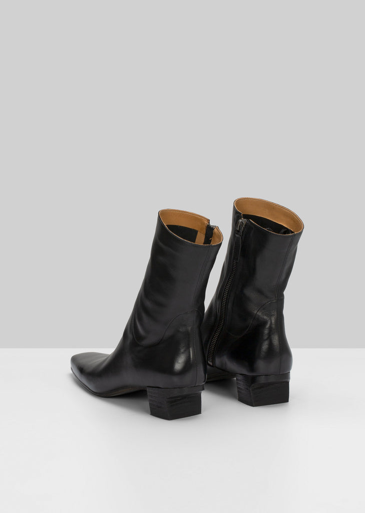 Marsèll black sleek side-zip ankle boot with a U-shaped seam at side and grounded on an angled low block heel in light, supple leather. Heel height measures approximately 1.5".