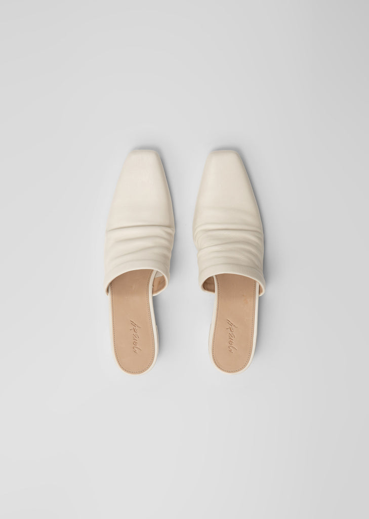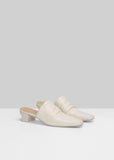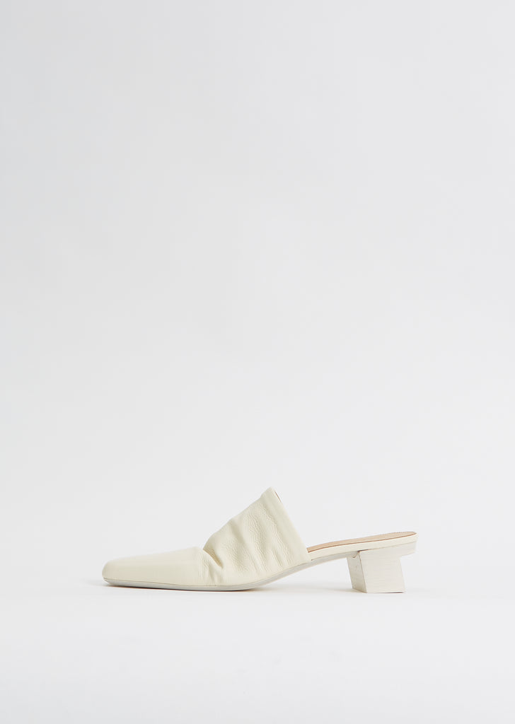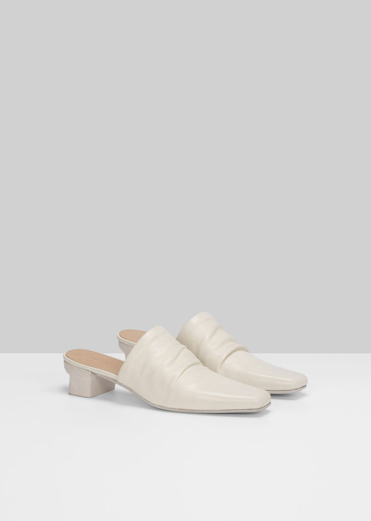 Marsèll latte-tone closed-toe heeled mules with a subtle ruching at upper and grounded on a hand painted angular block heel in a light, supple leather. Heel height measures approximately 1.5".