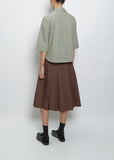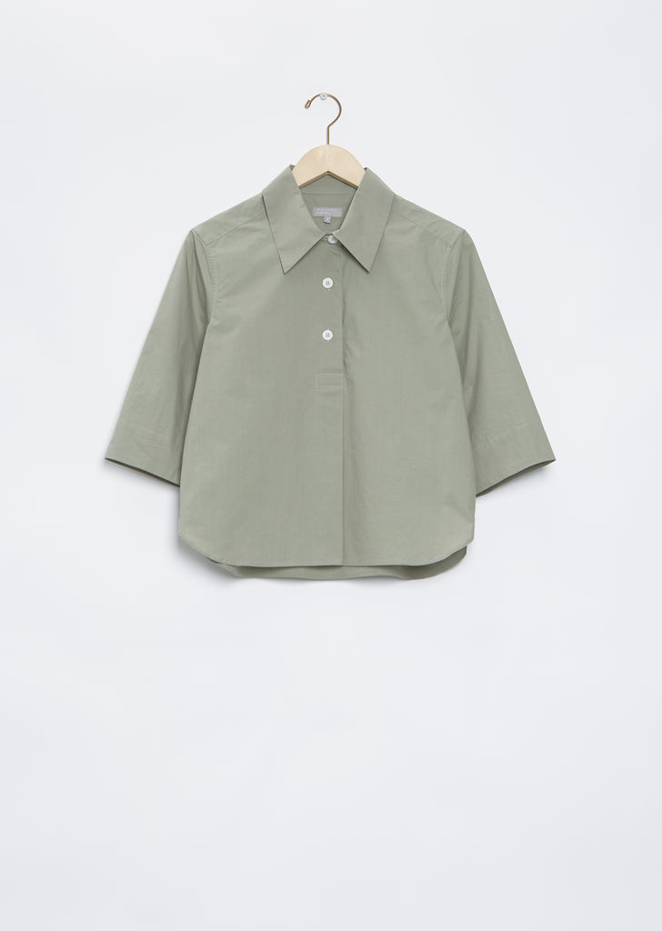 Margaret Howell fossil green three-button popover shirt with 3/4 wide sleeves in a crisp cotton poplin.