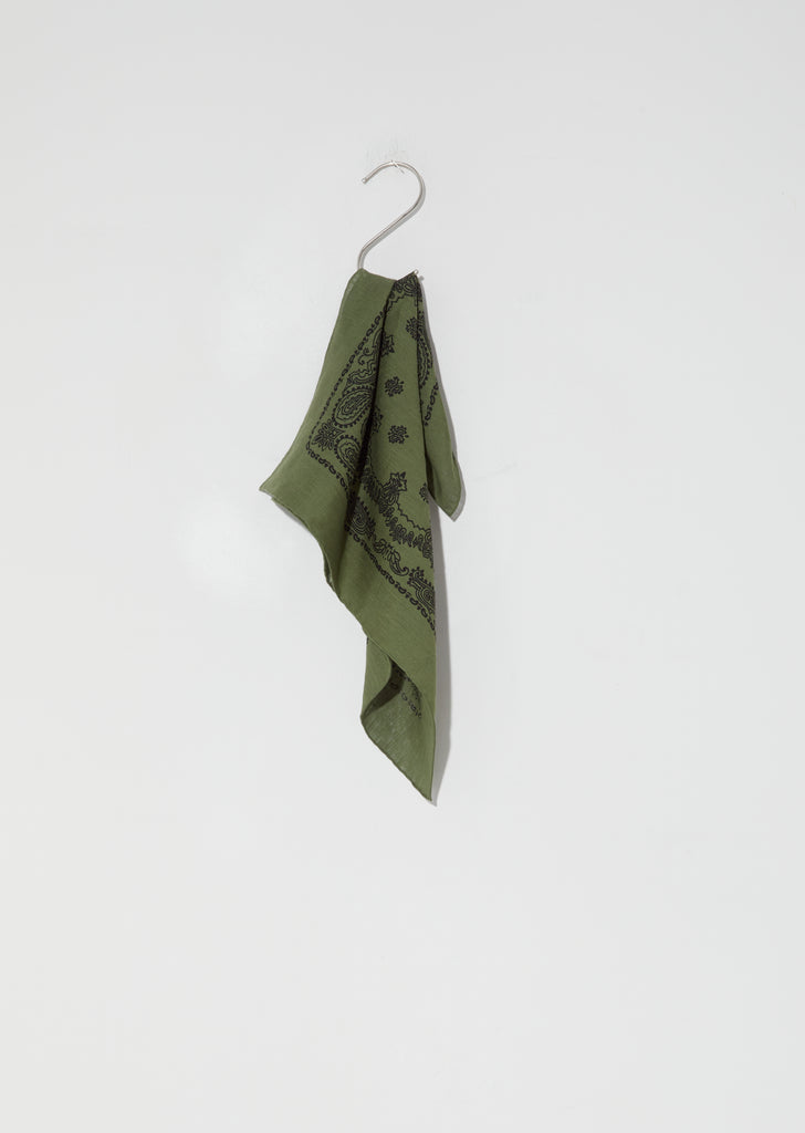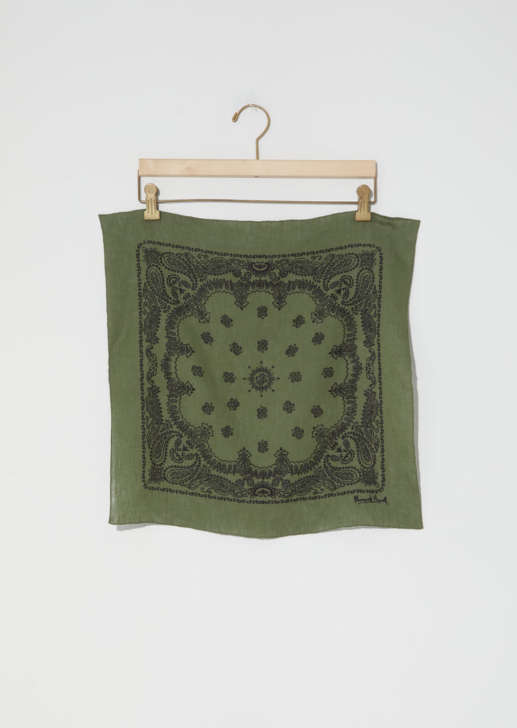 Margaret Howell fern green and black paisley print scarf in linen voile. Measures approximately 19" square.