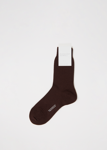 Margaret Howell signature plain stitch ankle socks in wine knitted in a merino wool and nylon blend. Ribbed cuffs.