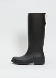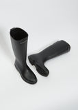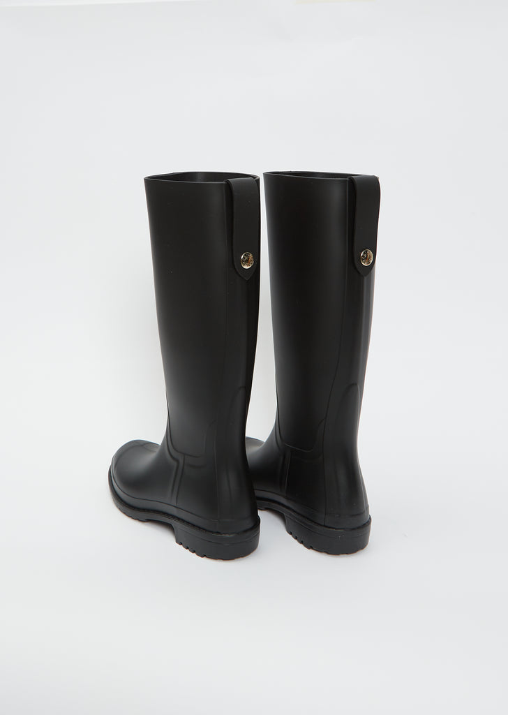 Mackintosh black tall rain boots with a shaped shaft and snap closure back tab in a smooth matte rubber.