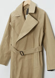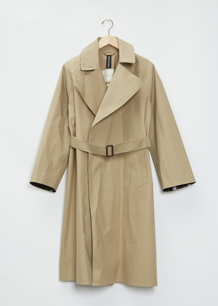 Mackintosh beige rain trench coat with a large notch collar, raglan sleeves and removable self belt handcrafted in a water resistant bonded cotton.