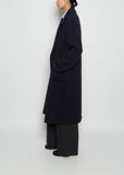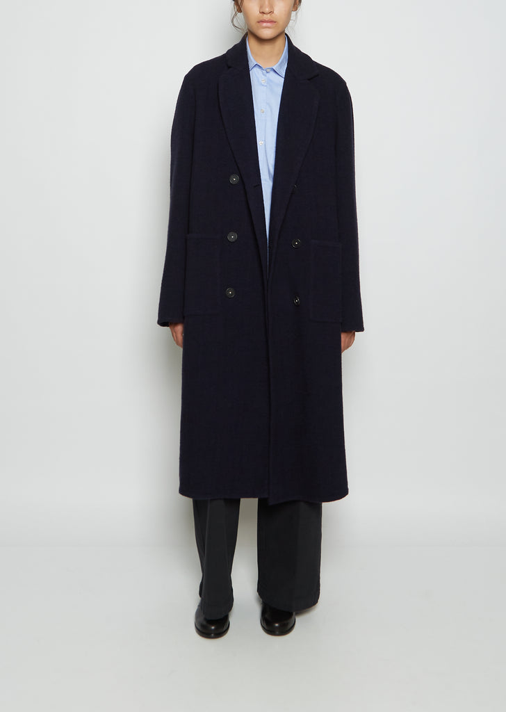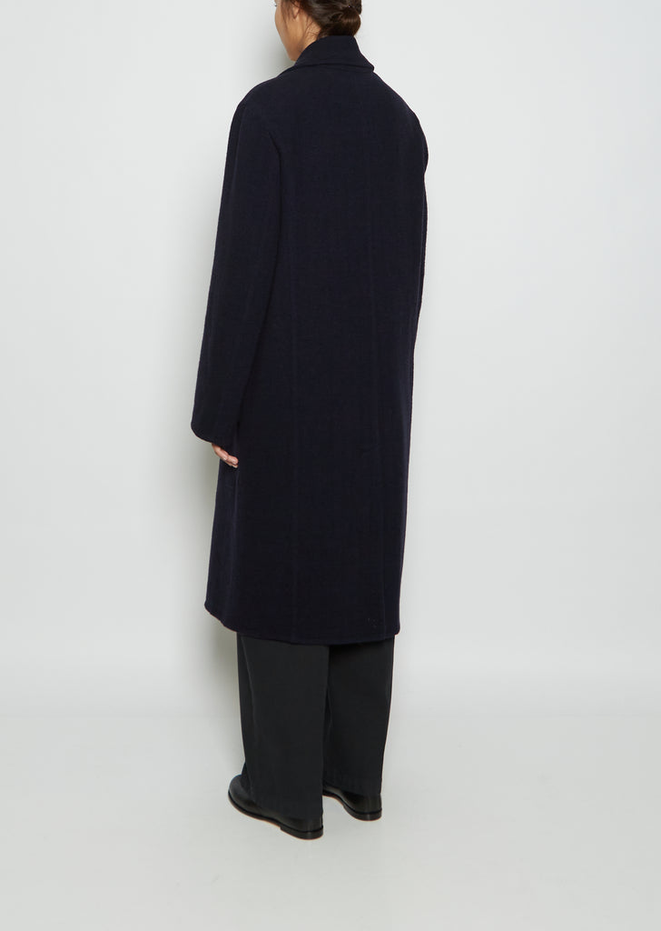 Massimo Alba navy blue double-breasted duster coat with a notch lapel and two front patch pockets made in a soft fleece wool. Features black custom buttons and a back vent.