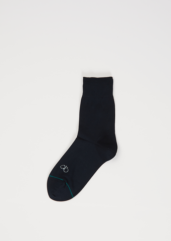 Minä Perhonen short dark navy socks with a signature intarsia butterfly at the toe and ankle in a nylon and silk blended knit. Features a contoured heel and toe for a snug fit.